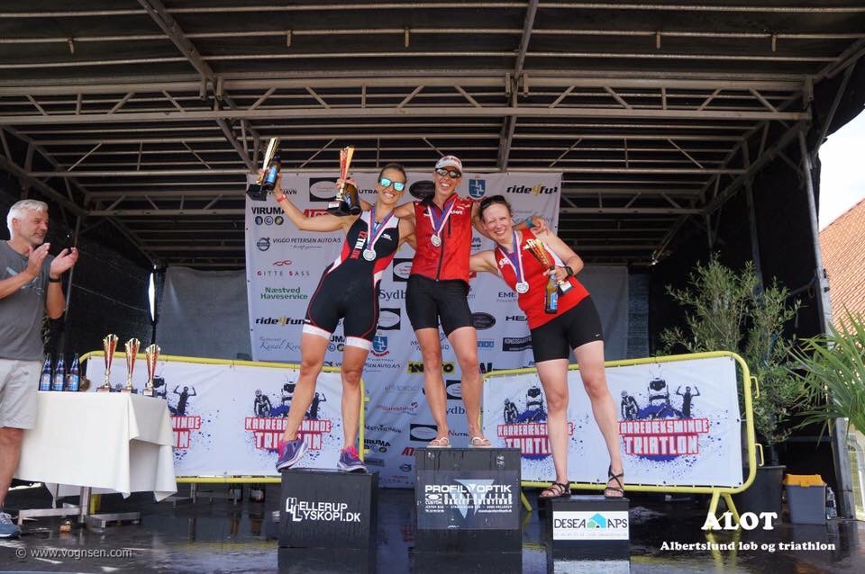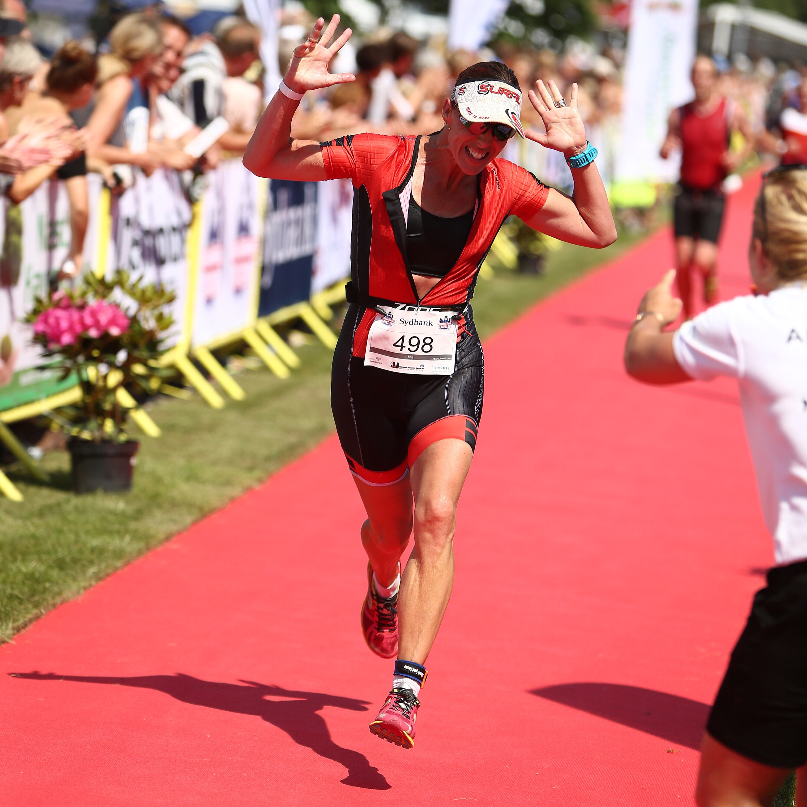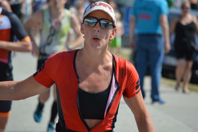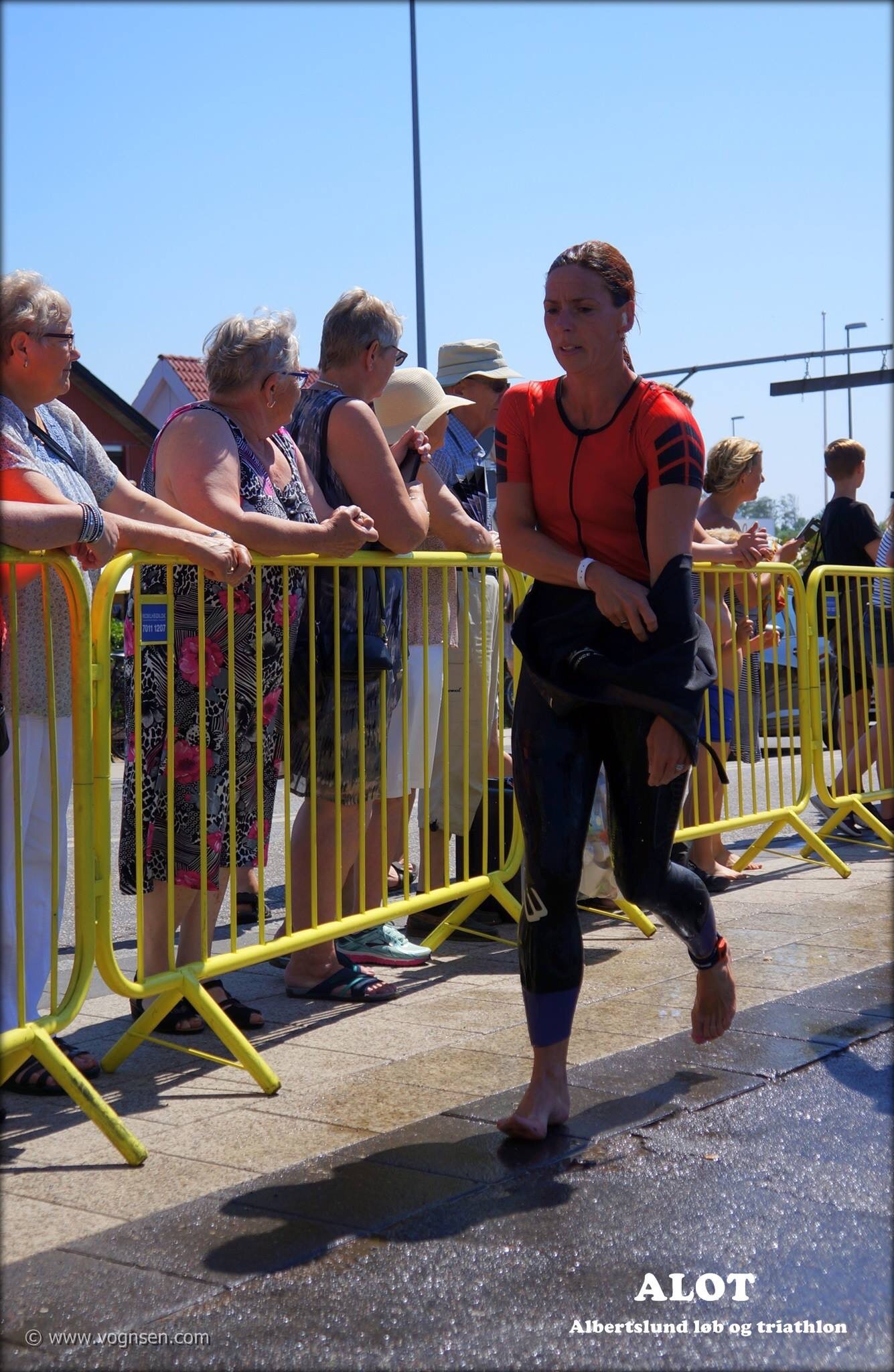 Ind i t2 med helt vild stemning i opløbet. Fantastisk! Lynhurtigt ud igen i løbesko på de 10,5 km i stegende hede. Den var streng i Sommerhusområdet, hvor vinden stod stille. Heldigvis var der mange lokale der havde sat vand ud til os og haveslanger med brus, vi kunne løbe igennem – total redning!