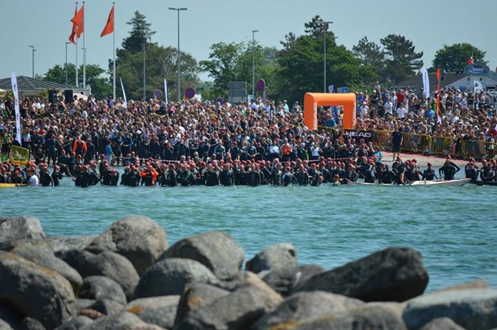 Jeg er ikke meget for de massestarter på svømmedelen, men var ok rolig med erfaring i depoterne fra sidste sæson. Alligevel ærgrer det mig,når det ikke lykkes at svømme crawl hele vejen rundt. Når 350 starter samtidig er der jo nærmest en vaskemaskine på skylle- og slyngeprogram, der starter og det er hverken til at se, navigere, finde flow, eller få luft. Alle slås mod alle om at komme frem,så jeg måtte slå over i bryst og drive med flere gange til vi havde rundet 1. bøje.