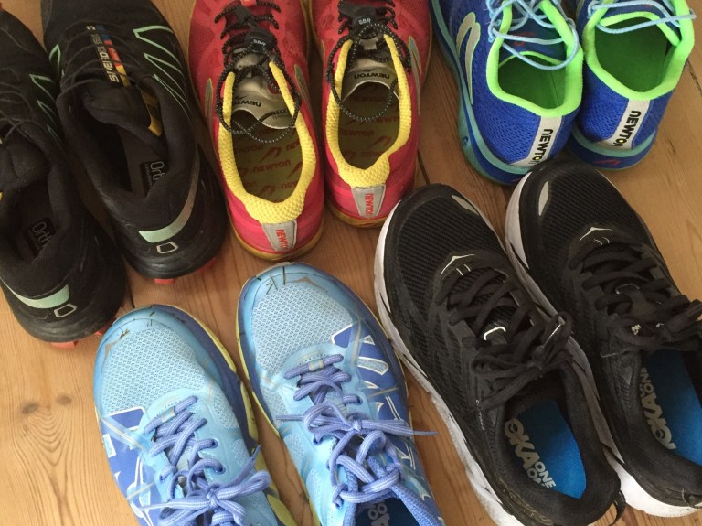 Jeg har i forbindelse med fødselsdagen fået hele to nye par løbesko til sko-familien. De er fra Hoka og jeg har løbet i mine nye Infinte til og fra job (de blå nederst til venstre), men i dag skulle Clifton 3 så testes – de sorte nederst til højre.