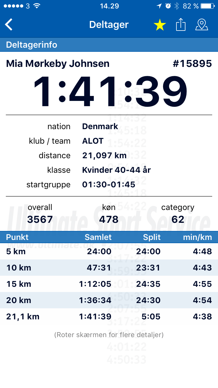 Jeg kom rundt uden at have en eneste km over 5 min/km og kun med lidt mavekneb. Og rimelig stabile km tider, dog stadig ikke negativ split…