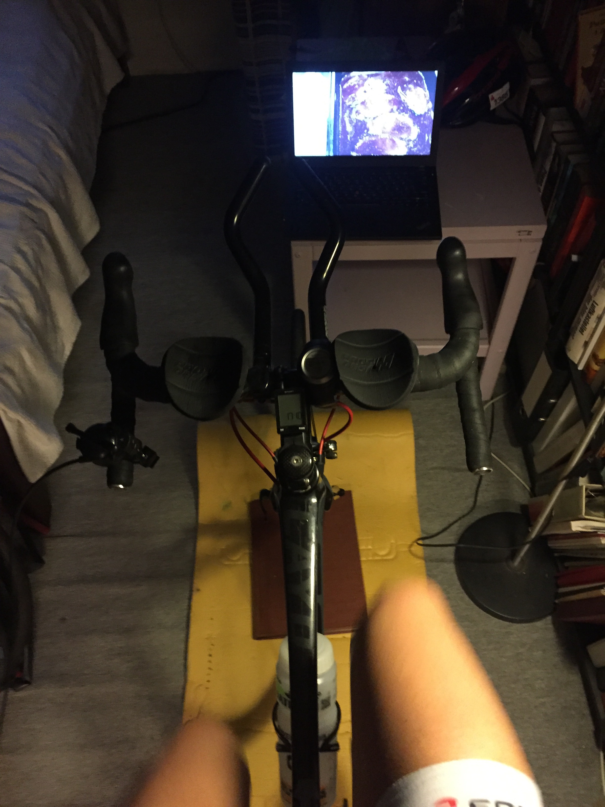 Havde så glemt træningsplanen ovenpå, hvorpå der står hvilke intervaller, jeg skal køre. Af cyklen igen – op og hente den – tilbage i kælderen – op på cyklen. Godt så – tjek…