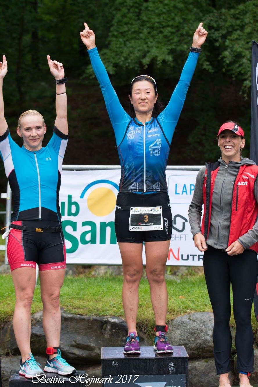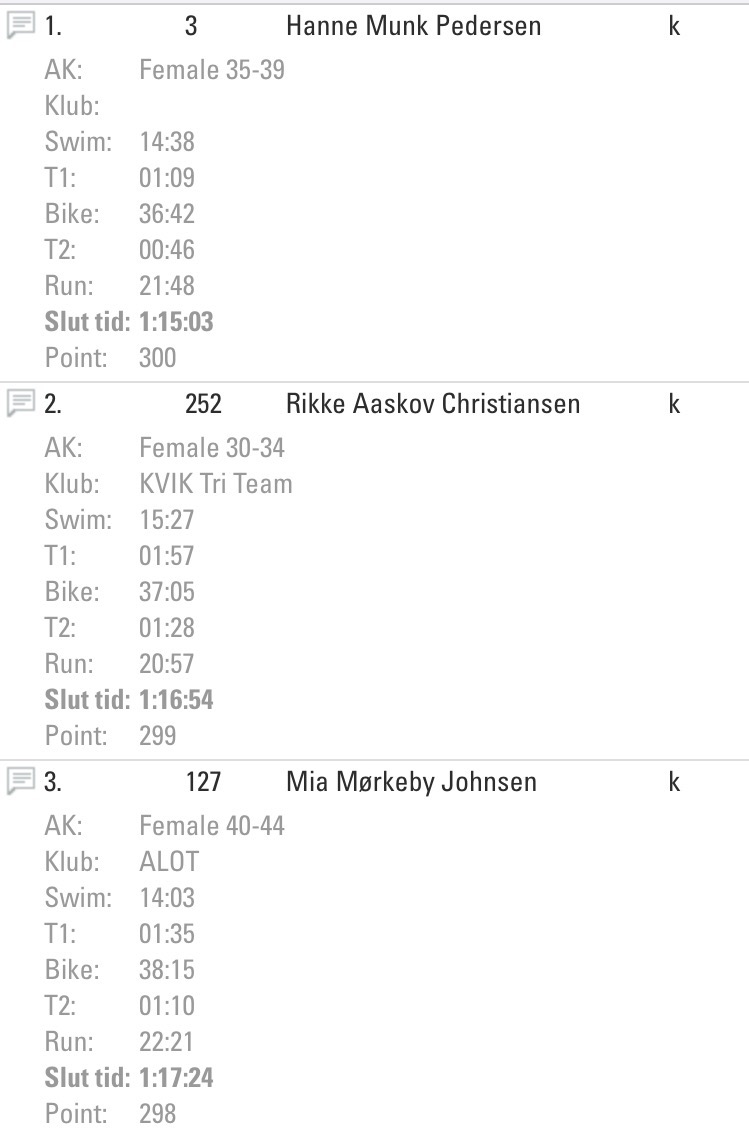 I mål går jeg direkte ud for at skifte tøj og mens jeg er i gang, bliver der råbt udefra om “der er en, der hedder Mia derinde – for du skal på podiet nu”. Jeg kaster noget tøj på og løber i bare tæer på den våde asfalt hen til podiet. Der gives highfives og gratuleres.