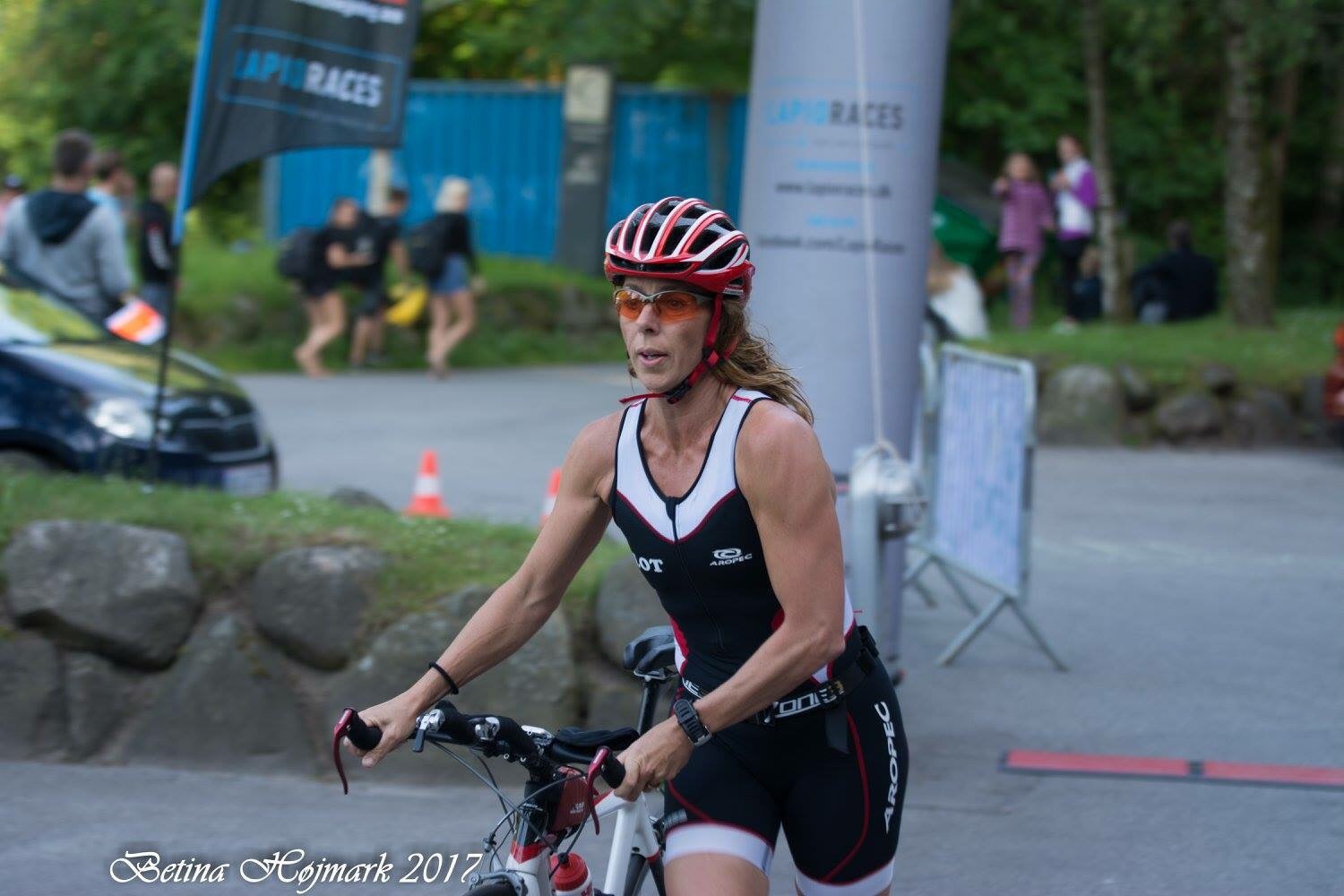 Nå ud på cyklen og her hentede jeg alle pigerne i løbet af de første 7-8 minutter. Så lå jeg længe og battlede med mændene – og kunne godt regne ud at de stærke piger måtte være langt foran mig pga svømningen. Det fungerede fint med det nye styrbånd, jeg havde sat på. Mit Garmin ur koksede – så jeg havde ingen idé om fart osv.