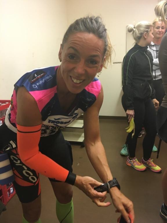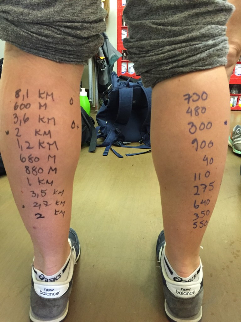 Vi skrev de enkelte distancer ned bag på Carolines ben med tusch, så vi kunne se, hvor langt vi var undervejs. Inkl. væskedepot og cut-off steder.