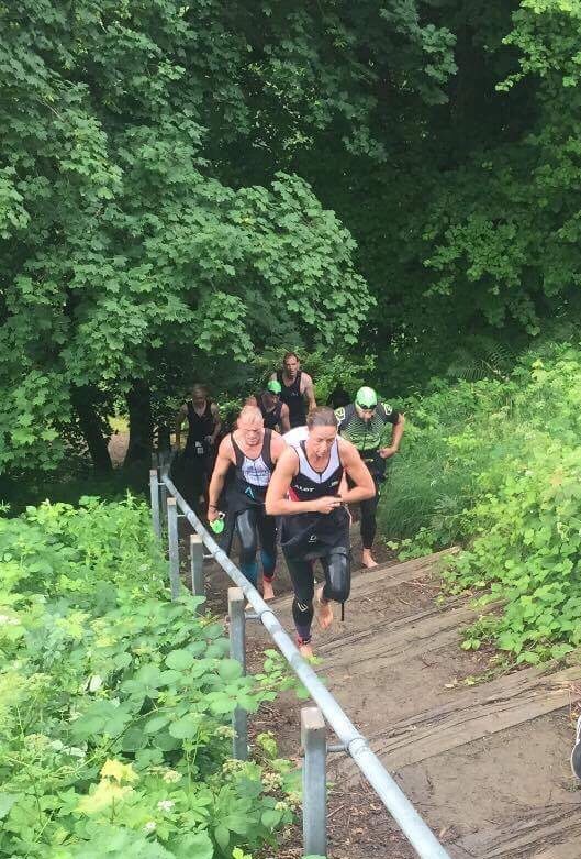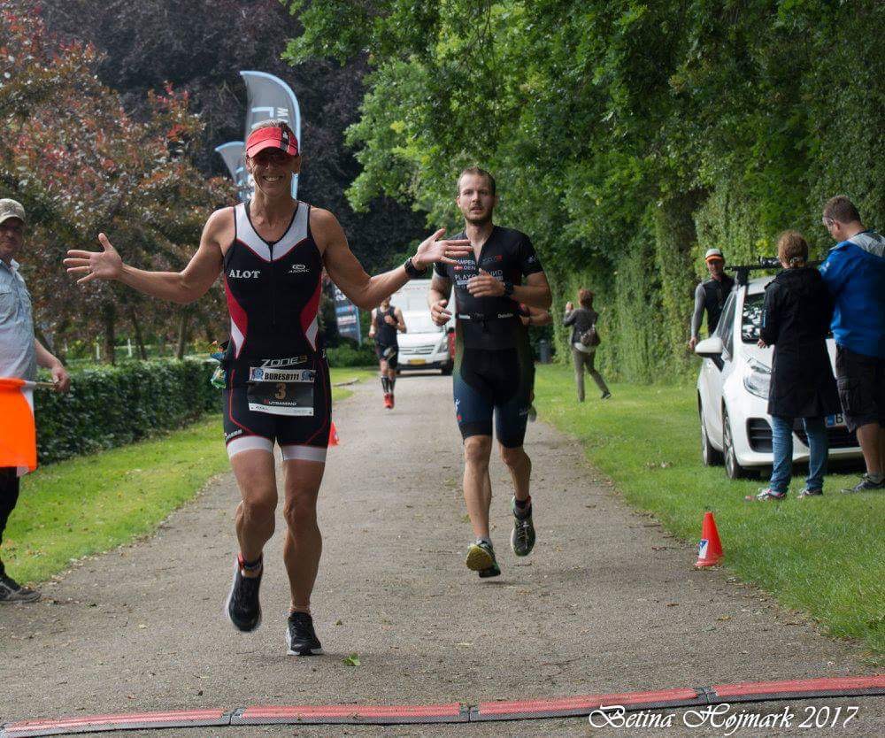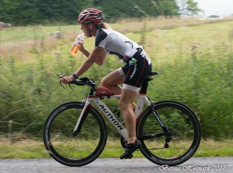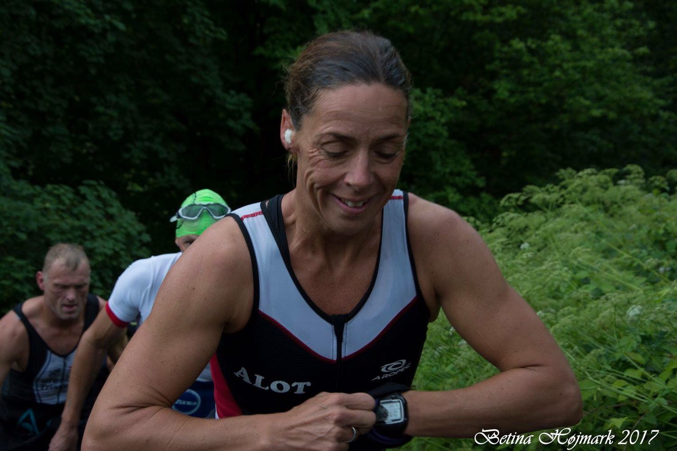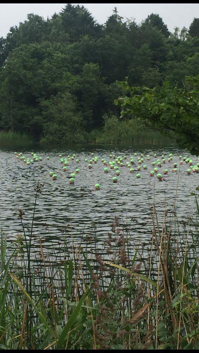 Det var en virkelige lækker svømning (1000 m). Vi skulle ud igennem sivene og så blev det dybt, så det var en “drivende start”, hvor vi alle ligger klar i vandet, når starten går. Jeg havde en dejlig svømmetur – godt flow, lækkert vand, solen brød endda frem der kl. ca. 8.45 🙂