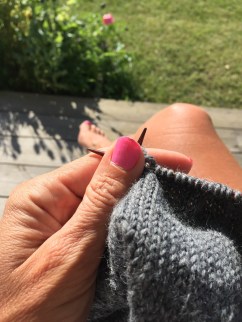 Vi besluttede at forlænge vores ophold i sommerhuset med nogle dage, så jeg tog bilen ind mandag på arbejde og havde 3 veninder med retur til pigerne om eftermiddagen. Træningsfri mandag med badetur og strikketøj. Aahhh.. Det er altså lækkert at have feriefornemmelsen i kroppen, selvom arbejdet er startet. De 3 andre har stadig ferie så denne uge er jeg både væk på arbejde og træning….