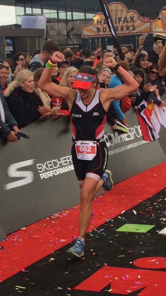 Jeg flyver igennem ALOT’ernes highfives og tilråb med et kæmpe smil på læben. Hold kæft, det har jeg drømt om, siden jeg første gang stod og heppede derinde for 2 år siden. De råber til mig, at jeg ligger nr 3 eller 4 i min age-group. Det er slet ikke vigtigt lige der. Så mange kendte ansigter, at jeg slet ikke når at skelne dem alle. Jeg ser dog Katrines tårer. Katrine som jeg tilmeldte mig IM sammen med og var på Mallorca med og som jeg længe troede, jeg skulle lave IM med, men som lod fornuften sejre og valgte IM fra i forsommeren.