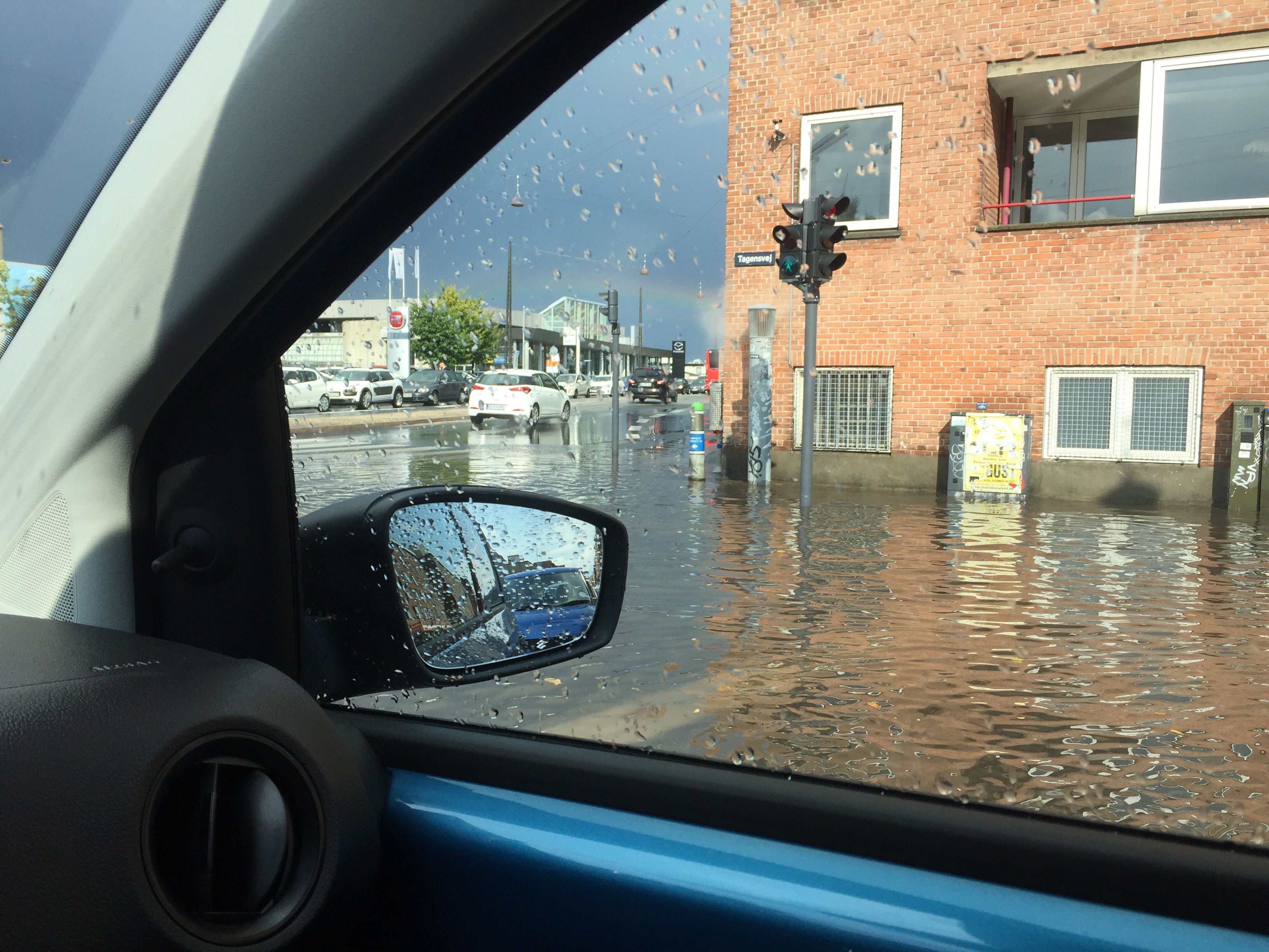Jeg hentede bare min bagage og gik mod min bil, som var parkeret på mit arbejde. Alle rystede på hovedet til hinanden. Jeg spiste en skønt æble og en våd kanelgiffel. Fik spontant den idé lige at snuppe en hurtig skyller og få tørt tøj på, inden jeg kørte hjemad. Jeg har håndklæde osv liggende fast på arbejde. Det blev jeg glad for )selvom der kun kom koldt vand ud af den weekend-lukkede-varme hane) da jeg kørte hjemad og det tog en evighed at komme hjem. Vejene var oversvømmede eller fulde af hagl.