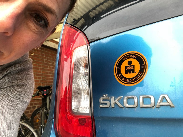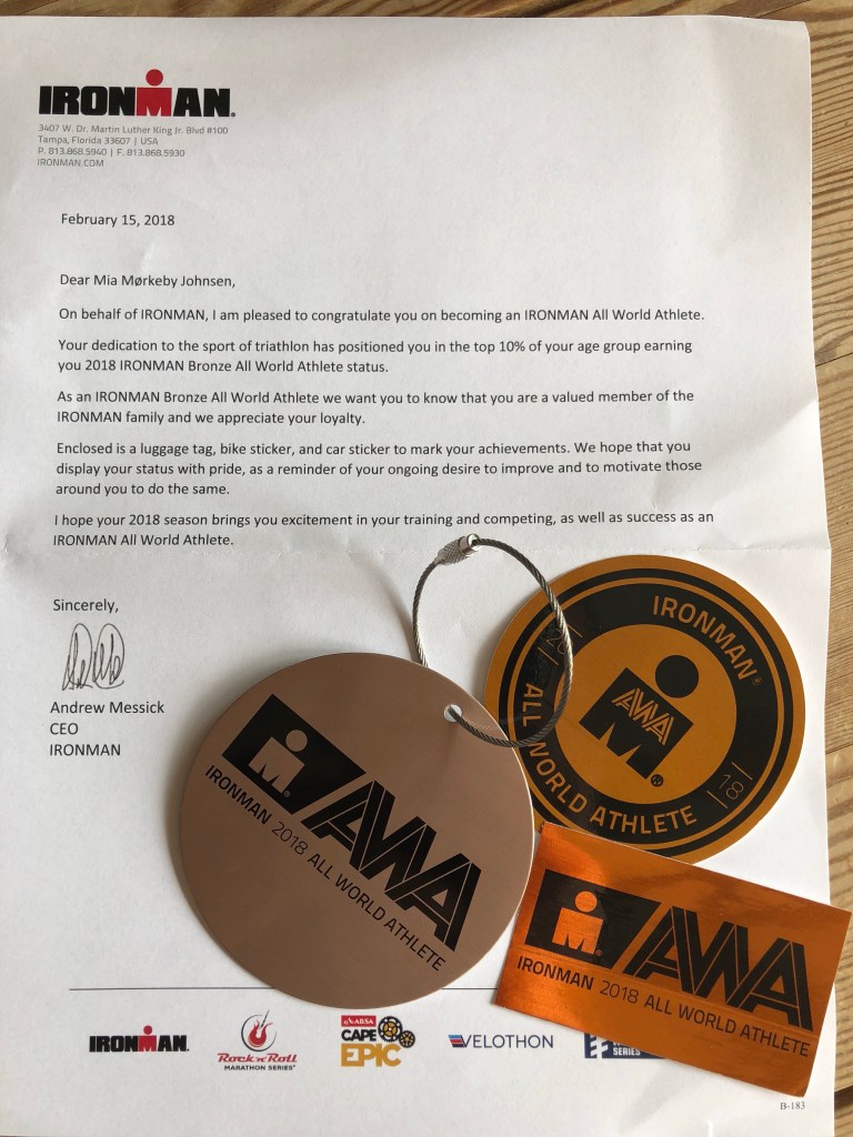 Jeg fik post i dag – sådan rigtig post fra postmanden. Et klistermærke til min cykel, et mere til min bil og et kuffertmærke til at blære mig med (?), at jeg blev blandt de 10% hurtigste i min aldersgruppe til IRONMAN og dermed bronze status.