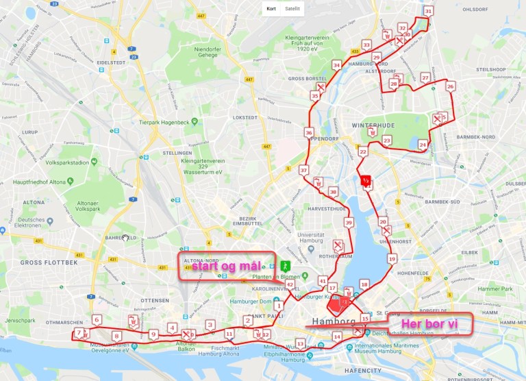 Caroline, Katrine og jeg har fået planlagt lidt mere omkring vores tur til Hamborg: Vi kører i min lille blå Skoda-bil St. bededag ca kl. 11 og skal bo genialt i forhold til ruten. Fredag aften har vi bestilt bord på Die Bank efter anbefaling. Lørdag skal vi ud og hente startnumre og vel bare ose lidt rundt – og spise kulhydrater. Og søndag går det løs. Jeg glæder mig! Vi overvejer, om vi skal spise sådan rigtig “typisk-tysk” på Groninger søndag aften og fejre marathon (et lokalt bryggeri, i en kælder med rigtig stube-stimmung). Mandag kører vi hjem igen. Det bliver mægtigt!