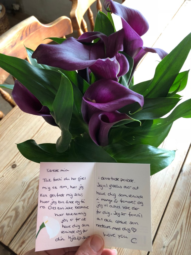 Fredag svømmede jeg – endelig sammen med Caroline. Hun havde en fin blomst med til mig og det sødeste kort, som tak for en håndsrækning. Jeg blev så glad og rørt. Igen og igen og begejstres jeg ved de venskaber, der er opstået via ALOT de sidste snart 4 år. Sikken en gave at få!