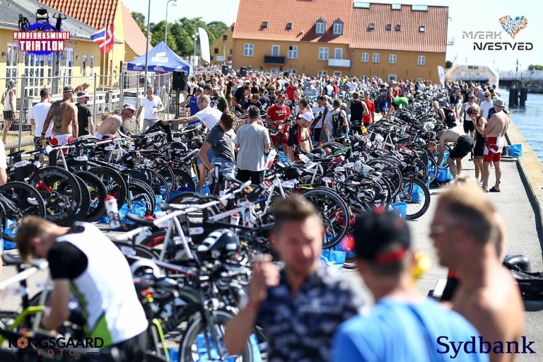 Alt det logistiske spillede ved dette stævne i år! Sidste år var vi næsten 1000, der startede i vandet samtidig, og skiftezonen var i 2017 flyttet fra havnen til et græs/sten areal overfor stranden. I år var skiftezonen flyttet tilbage på havnen på asfalten – super godt – og svømmestarten var delt op i en gun-start for de hurtigste og derefter rullende start med 10 atleter med få sekunder imellem. Perfekt. Det gav en mega god svømmeoplevelse, som dog var lidt længere end planlagt – ca 1300 m i stedet for 950 m, men pyt det er jo ens for alle. Jeg kom rundt på 24 minutter i et fint flow fra start til slut. Jeg fik sparket mine briller af af en medsvømmer og måtte lige bruge lidt på at få dem på plads.