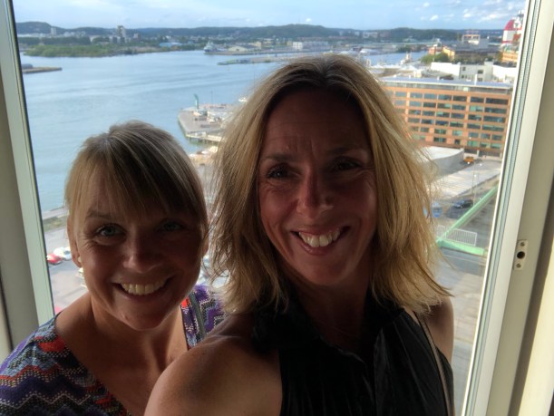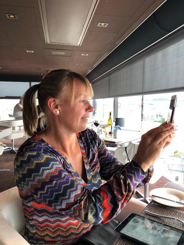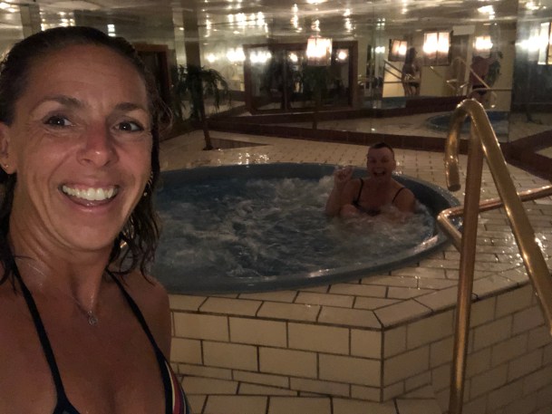 Da vi havde tjek på transporten, varmede vi musklerne op i spa’en og i saunaen. Lækker luksus at få vasket køreruten af os og gøre os klar til dinner i skybaren.
