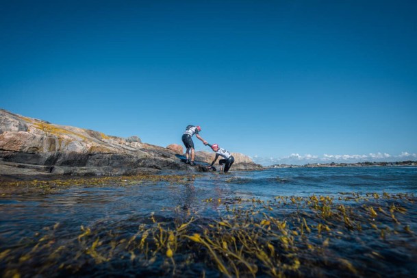 Swimrun er i høj grad teamsamabejde; at kunne fornemme, læse og forstå hinanden uden at tale undervejs. Jeg fik signaleret at vi skulle holde mere mod venstre under svømning ved at lægge mig ud på siden af Caroline, hvor jeg ellers lå bag hende – for at få hende til at skifte retning. Og hun forstod. Ellers lå vi også meget side om side og Caroline ved, hun skal ligge på min højre side, så jeg kan se hende, når jeg tager luft. Omvendt ved jeg, at hun skal presses på det sidste løb. Da Caroline efter knap 5 timer havde mere lyd på vejrtrækningen, foreslog jeg at hun tog endnu en omgang astmamedicin – samtidig med at hun selv tænkte det. Så vores team fungerer bare!