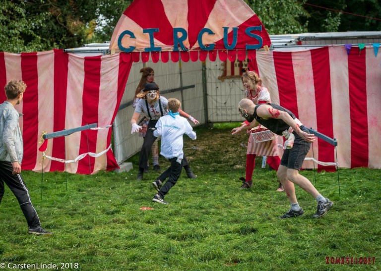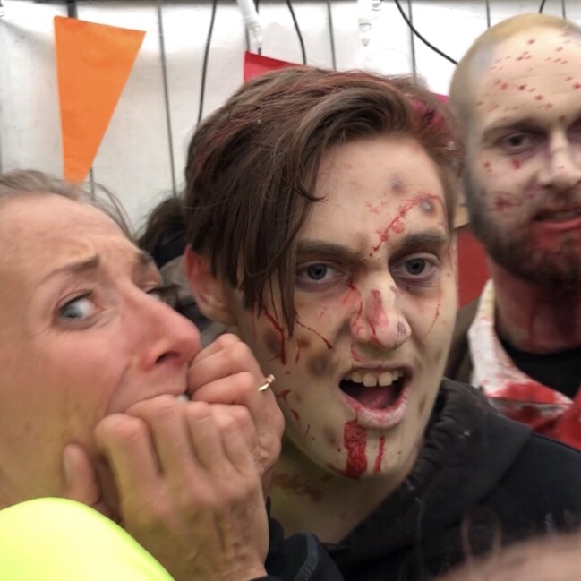 Det er så fedt og sjovt at komme rundt og møde zombierne og fortælle dem at løbet er slut og de godt kan falde ud af rollen. Særligt var det sjovt ved cirkus-tema-zonen, hvor vi blev taget fusen på af zombierne og trængt op i en krog. Videoen illustrerer det meget godt!