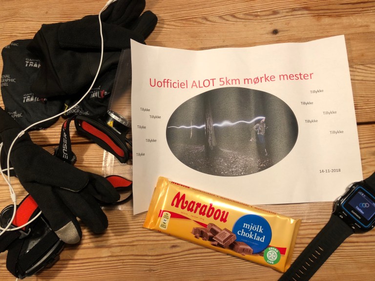 Så jeg lagde mig sammen med 3 herrer, så de ku vise vej og vi holdt et pace på ca 4.50 i mørket. Så jeg nappede den uofficielle titel og præmiechokoladen med hjem:-)