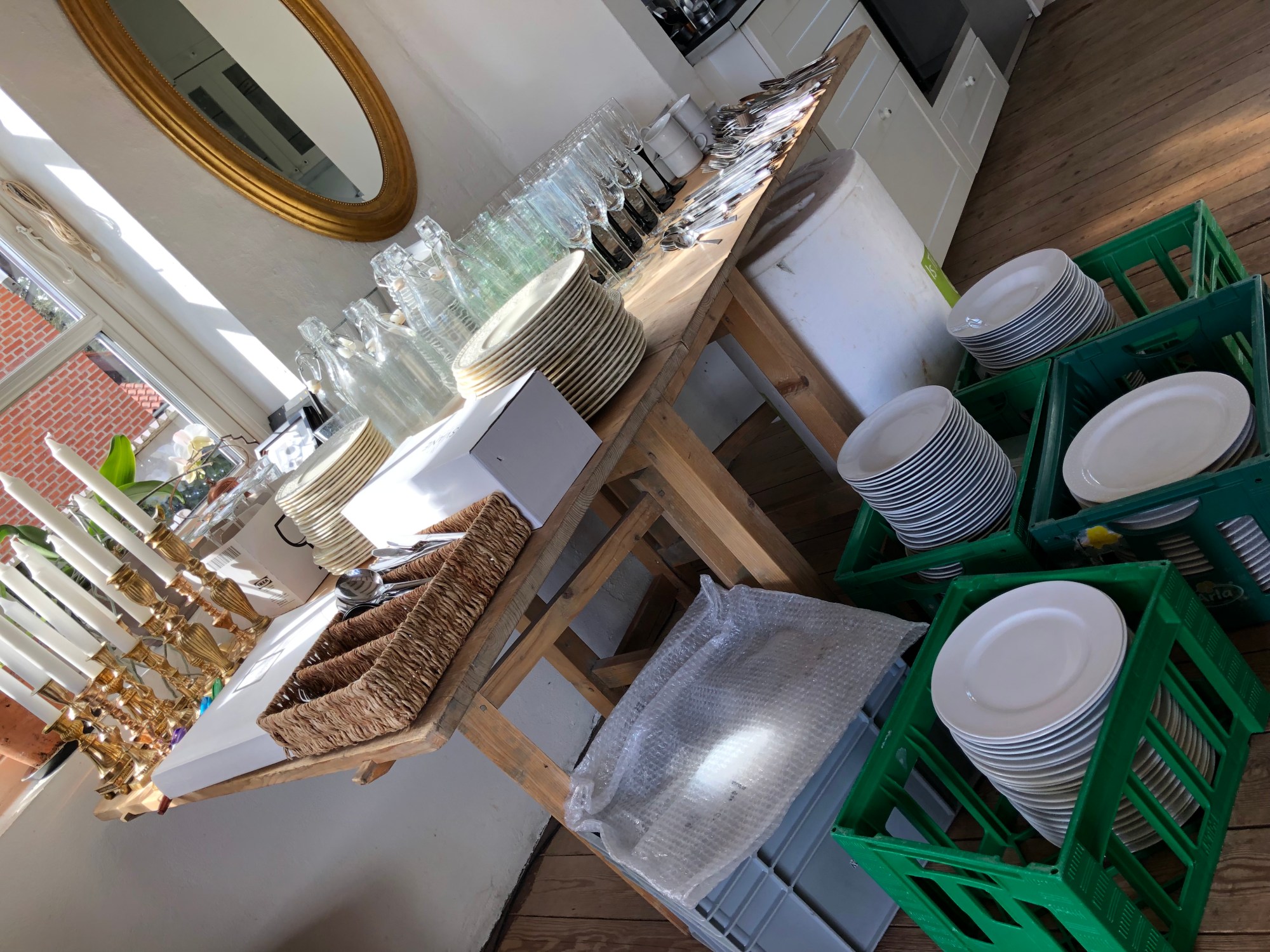 Lørdag er der blevet slået telte op i haven, mine forældre har hjulpet med vinduespudsning og lugning af fortov, Carla og min mor har pudset samtlige husstandens 12 messingstager. Jeg har samlet service sammen fra gode naboer, kaffekander, varmeblæsere, pynt osv. Og jeg har fået blomster i krukkerne og satser nu på at nattefrosten har forladt landet.