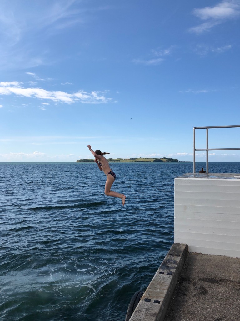 Da Mellanie var kørt, var hele sommerhusflokken på 10 personer klar til et dyp i havnebadet. Der blev sprunget fra 3-4 m uanset alder:-)