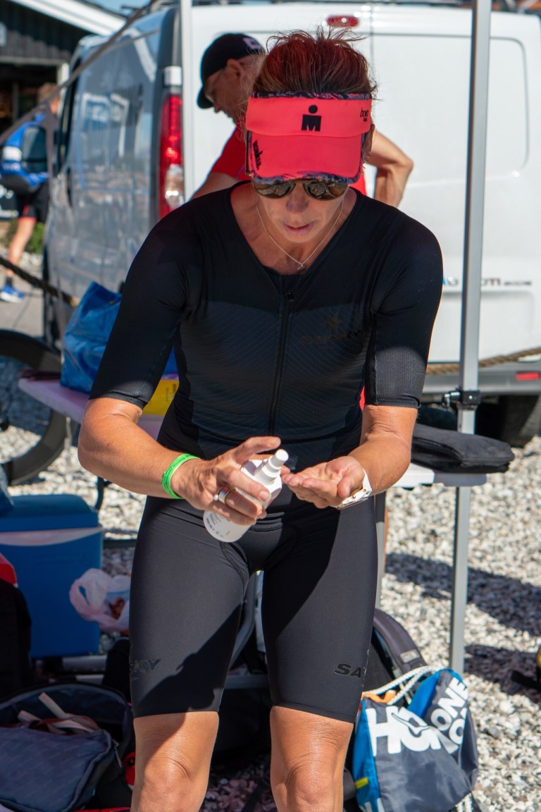 Jeg er blevet SERIØST dårlig til at svømme i bølger, så jeg svømmede bryst helt ud til 3. bøje og dermed med hovedet ovenvande de første 600 m, mens vi havde modtstrøm. Jeg får kvalme og blive top-rundtosset af at kigge ned på bunden. Så først da vi fik medstrøm, kunne jeg svømme crawl og opleve bare et minimum af “flow”. Jeg havde derfor en ret ringe svømmetid på næsten 43 minutter, og havde tracket næsten 2100 m fremfor de 1900 m som stævnet indebærer. Der blev råbt til mig, at jeg var nr 10, da jeg kom op af vandet, og jeg havde allerede under brystsvømningen tænkt, at der røg den podieplads.
