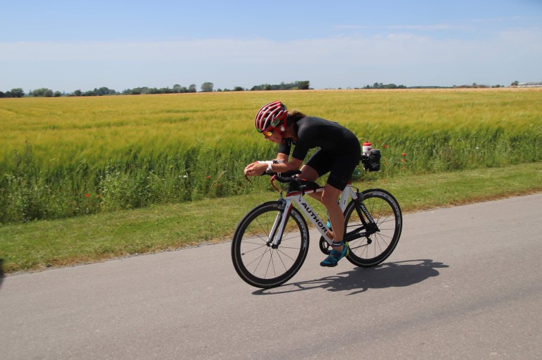 Cyklen gik rimeligt – jeg holder næsten 34 km i timen. Der er en del dårlig asfalt og varmen og vinden tiltager i løbet af dagen. Vi cykler 4 runder a 22.5 km. Jeg cykler også forbi en medrytter, der er styrtet og finder først bagefter ud af, at det er en klubkammerat. Det er aldrig rart at overvære. Brækket kraveben og asfalteksem. Jeg mærker varmen meget intenst i bølger på min sorte dragt, det brænder indimellem. Søger skyggen ved træerne, men den er der ikke hele tiden. Begge mine drikkedunke er helt tomme. Jeg har taget nye ved hvert depot og pøset koldt vand over mig selv. Jeg bliver overhalet af mænd, der råber heppende tilråb. Jeg ender med at have den bedste cykeltid blandt alle kvinder. 2.39.18