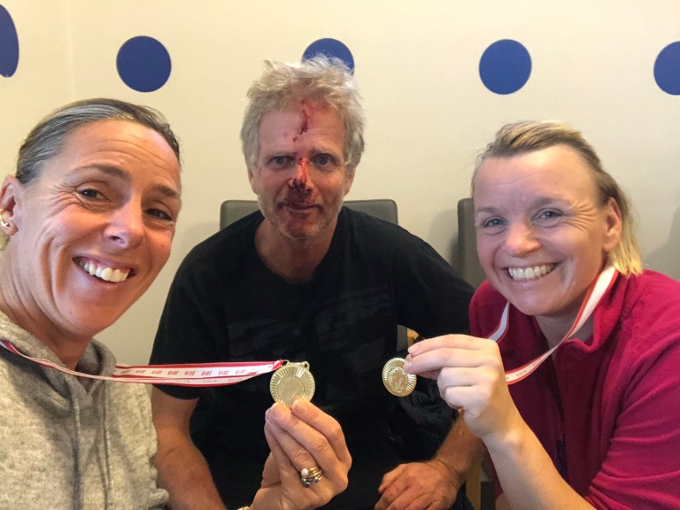 Søndagens Skovmarathon i Hillerød med en håndfuld klubkammerater fra Alot sluttede lidt træls for Morten, da han styrtede og tog fra med ansigtet. Caroline og jeg tog med på Skadestuen, så han ikke skulle køre bilen hjem. Efter et par sting, der lappede læbe, næserod og næsetip sammen og en henvisning til tandlægen for at ordne en flækket tand og et par andre, der var slået op, kunne vi køre hjem med den skadeslidte til et par dage på langs. Så Carolines og mit målfoto er lidt alternativt… God bedring Morten!