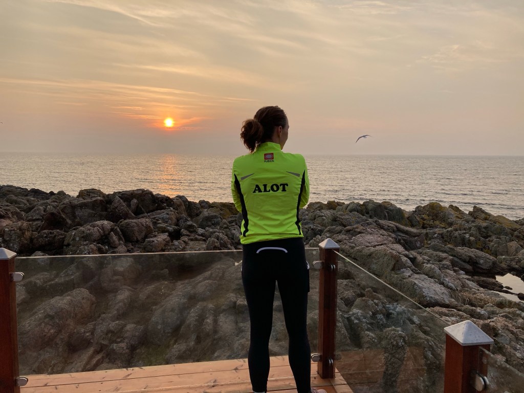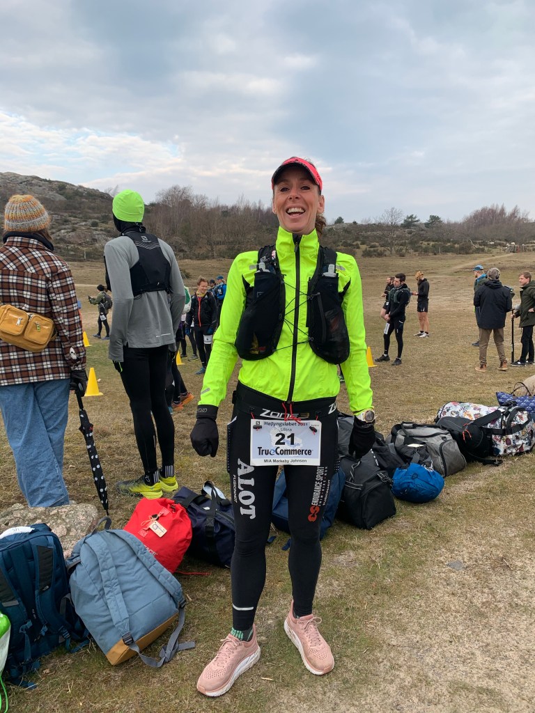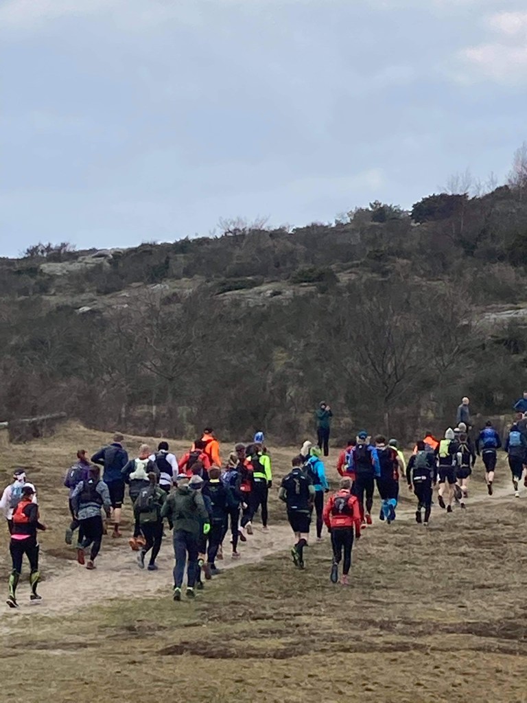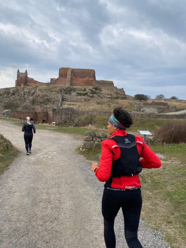 De sidste 2 km gik det nedad fra skoven mod havet i Ålsdalene. Hele østersøen lå åben for os. Medvind ned af bakke. Vi hjalp en medløber med lidt mandler og salt, da han krampede helt sammen. Pludselig kunne vi begge mærke knæ og lysken og alle dele af vabler, led og muskler. Få km inden da havde jeg lige sagt til Mandy, at jeg kunne fortsætte for evigt, men med udsigt til mål blev historien lidt en anden. Selv maven holdt så det kunne ikke være bedre! 1150 højdemeter har vi sat i banken…
