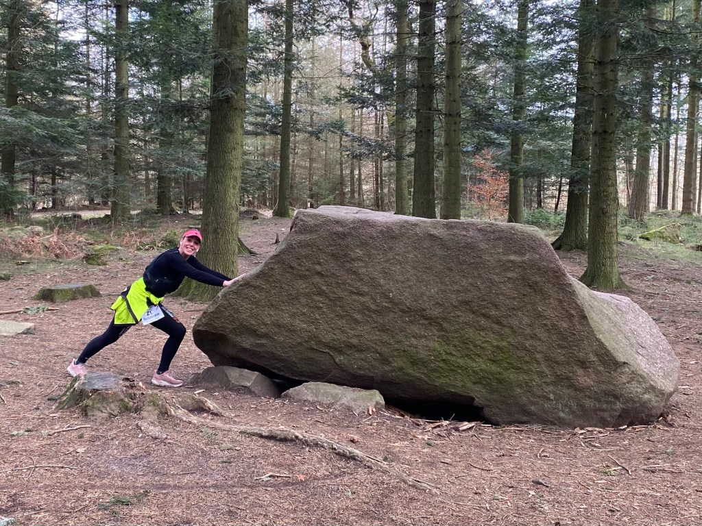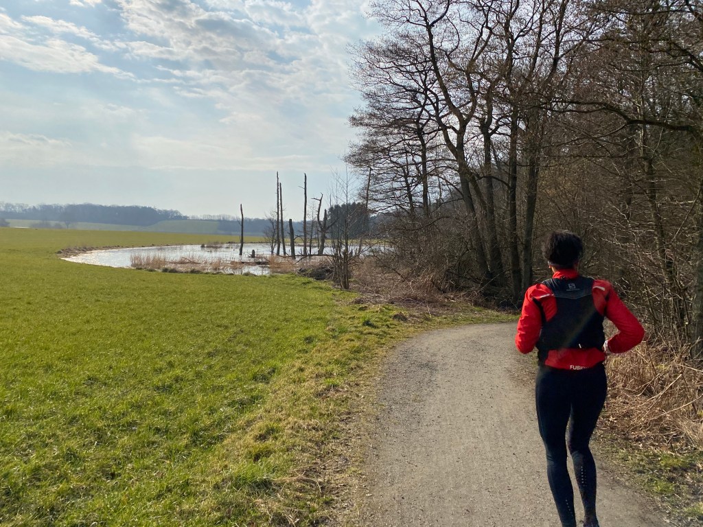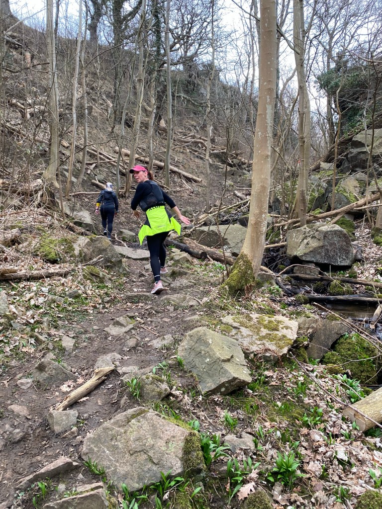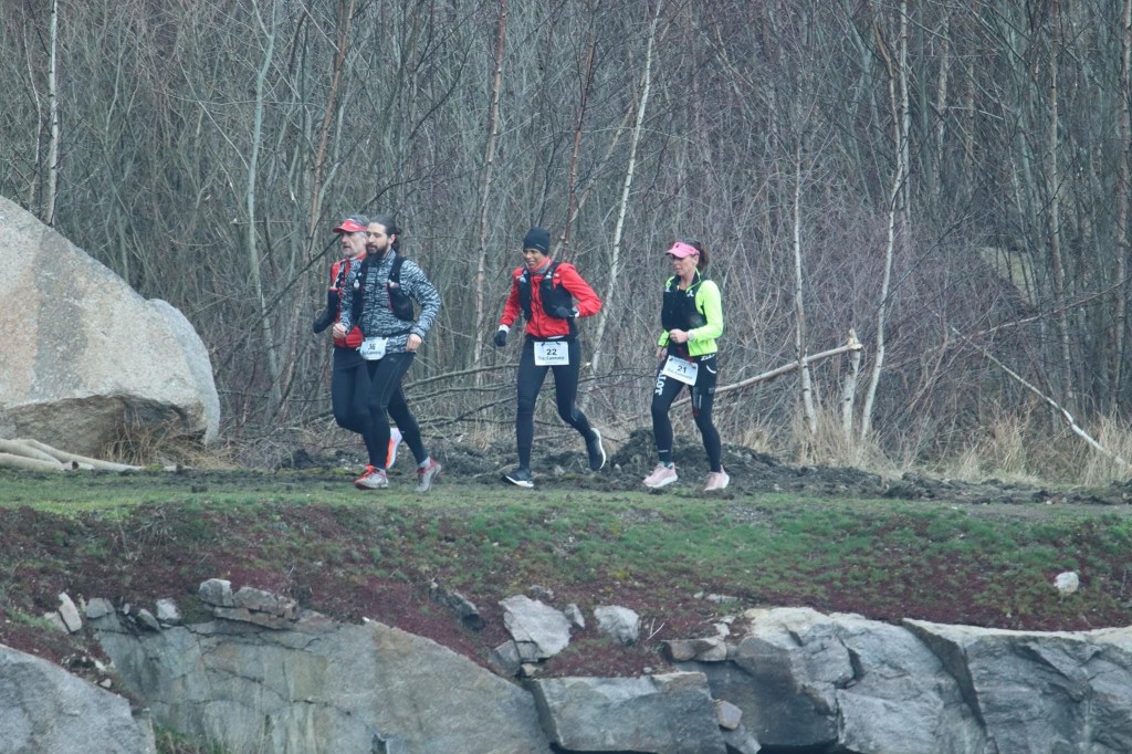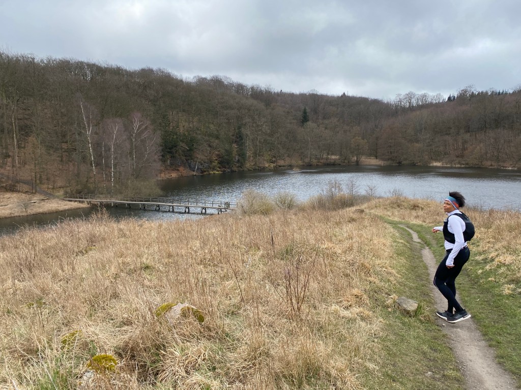 Den første etape var på 25 km, før vi kom til det første depot. Vi løb gennem smuk skov og søer, små klippefremspring, men også en del asfalt på cykelstier. Lige før første depot var vi igen løbet forkert, fordi vi overså et skilt og var optagede af ro ryttere til hest, så vi kom skævt til depot. Jeg havde plottet de vigtigste punkter ind på telefonen, så vi fandt vej ved hjælp af dem.