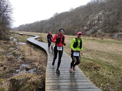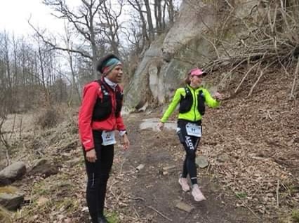 2. Depot var lige før Ekkodalen ved 41 km. Vi havde hørt fra to klubkammier, at de måske ville møde os, så pludselig stod Tina og Charley med lånehund på stien. Det var genialt! Vi fulgtes til depotet i let løb. Her begyndte det at regne, så det var et vådt ophold i depot. Jeg havde planlagt at skifte sko til trailsko i depotet, men glemte alt om det. Det fortrød jeg senere…