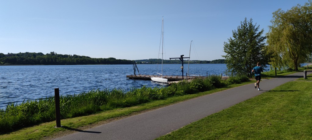 Jeg havde på intet tidspunkt tvivl, om at jeg kunne og jeg overvejede heller ikke at udgå. Jeg havde troet det ville være en større mental udfordring men jeg må have haft en god dag. De første tre runder havde jeg t-shirt på og så skiftede jeg til singlet. Jeg skiftede ikke sko undervejs. Der var heldigvis skygge på hele den ene side af søen. Det var så smukt, og der var livlig trafik og aktivitet af lokale hundeluftere, børn på cykler, kærester hånd i hånd, SUP boards på søen sammen med vandcykler og kajakker .