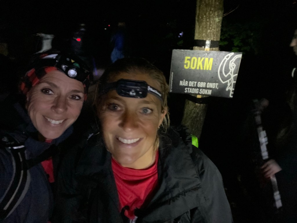 Vi var startet i den sidste startgruppe kl 14.30, så fordi vi lige brugte 20 minutter med TV2, føltes det pludselig som om, at vi var de allersidste i mørket. Vi skulle til selv i højere grad at navigere og kunne ikke blot følge efter de andre. Det var svært i mørket, men ruten var de fleste steder markeret fint med refleksbånd som vores pandelamper oplyste.