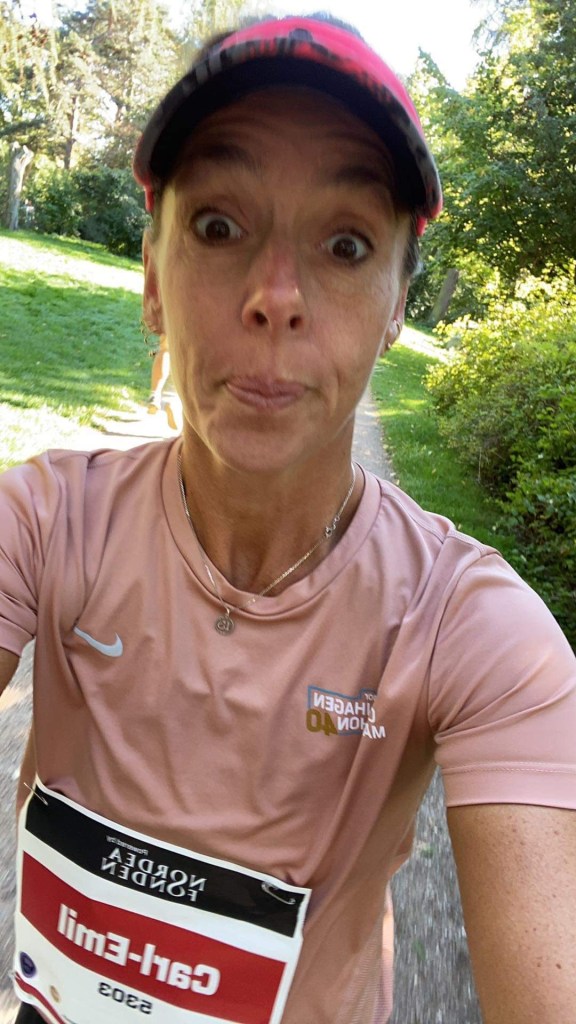 Jeg løb som Carl-Emil og Pia i dag, igen på overtagede numre havde dem begge på maven. Carl-Emil er nok ikke helt tilfreds med sin tid på 1.43.22 (hvilket ville placere mig som nr 48 ud af 600 kvinder i min aldersgruppe)