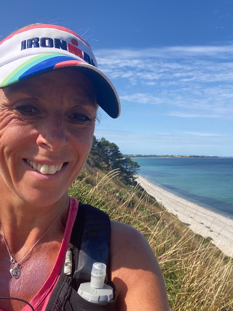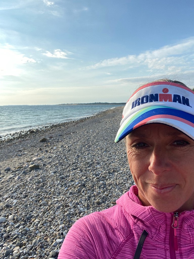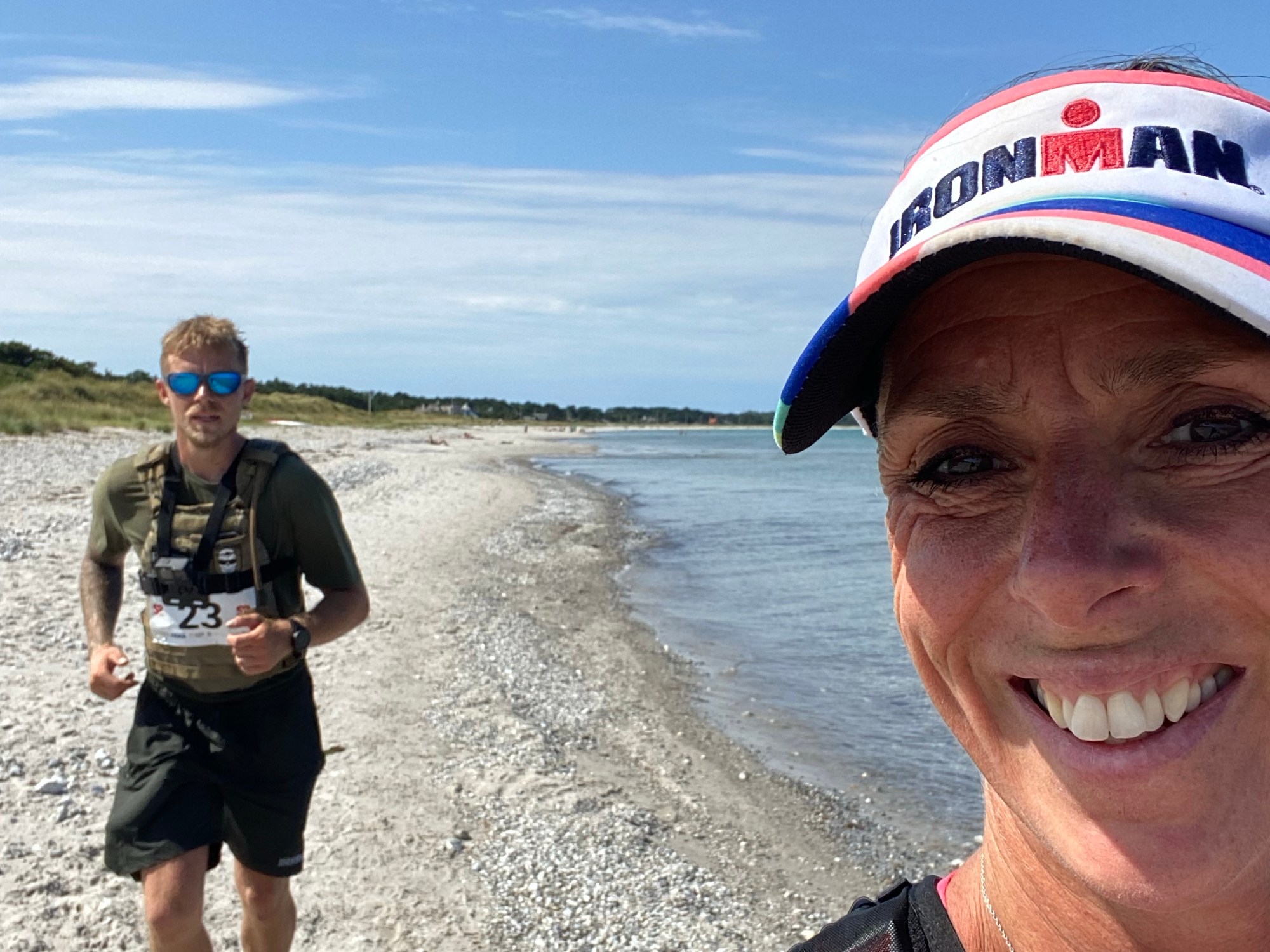 Varmen tog seriøst til, og jeg begyndte at trænge til at blive skyllet. Vi havde vores egne drikkevarer med – i veste, og der var 4 depoter, så jeg var nøjsom med vandet og brugte det ikke til at hælde ud over mig, selvom jeg virkelig havde lyst. Da vi havde rundet +20 km var der endelig en badebro og jeg lokkede en medløber (jeg fandt senere ud af, at han hed Patrick) med i havet med al tøjet på. Vi tog blot sko og vores veste af. Det var vidunderligt at blive afkølet og løbe videre i det våde tøj som kølede mange km fremad. Patrick løb i øvrigt med en 10 kg tung blyvest, fordi han træner op til en vigtig boksekamp.