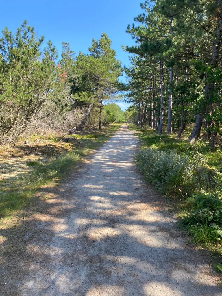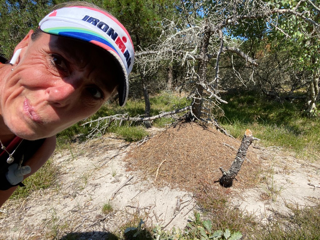 Ved det næstsidste depot fik jeg at vide, at jeg var nr. 29 ud af 31. Jeg var heldigvis ligeglad og tog mig tid til at tale med de frivillige fra SIND, som der blev samlet ind til i dag. Der var ca. 17 km tilbage og nu kom der først et varmt stykke med strandstier i fyrretræsområdet (jeg elsker duften af fyrretræer i varmen), dernæst skulle vi ind imellem træerne og løbe på stier af fyrrenåle i skyggen. Med fyrrenåle kommer også de flotte myretuer…