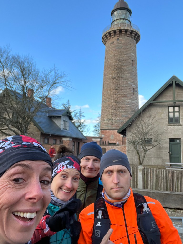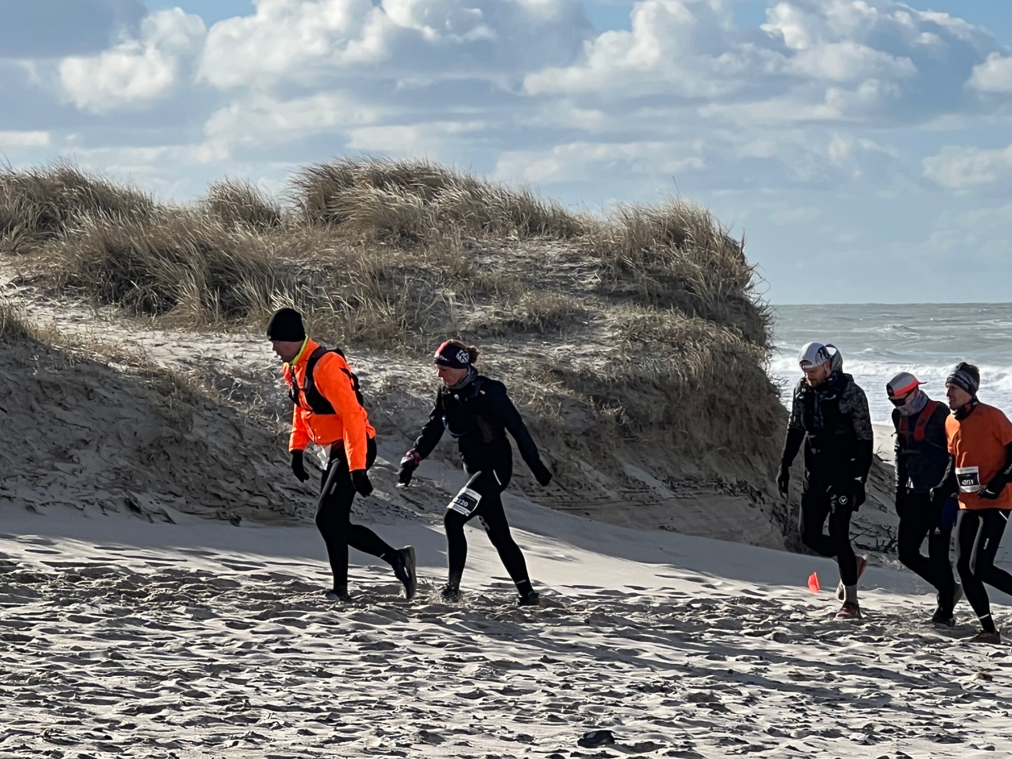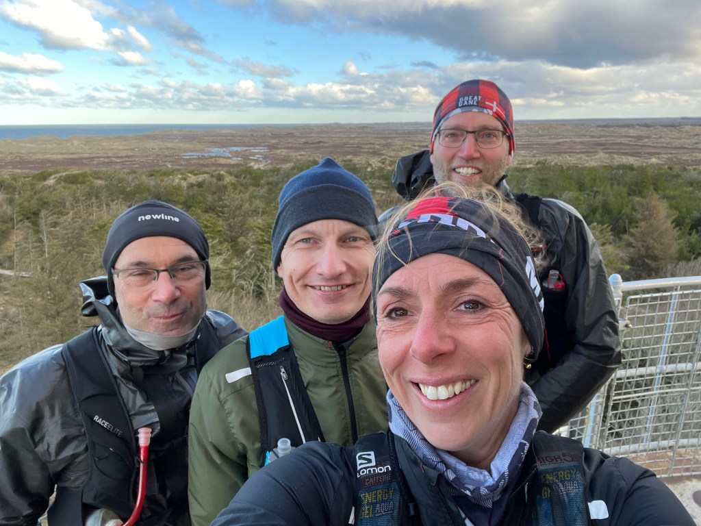 Vinden var hæderlig flere steder inde i land men langs havet stod vi stille op imod i modvinden. Sandet føg over stenoverfladen og havskummet dansede over mine sko. Jeg måtte trække min buff op over næse og mund for at undgå at vinden bed for hårdt i mine kinder. På et af strandstykkerne opstod der et spontant “tog” hvor vi lå på “hæl” af hinanden for at skærme hinanden for vind. Vi lå ihvertfald 5 løbere på den måde og samlede flere op som vi overhalede dem:-)