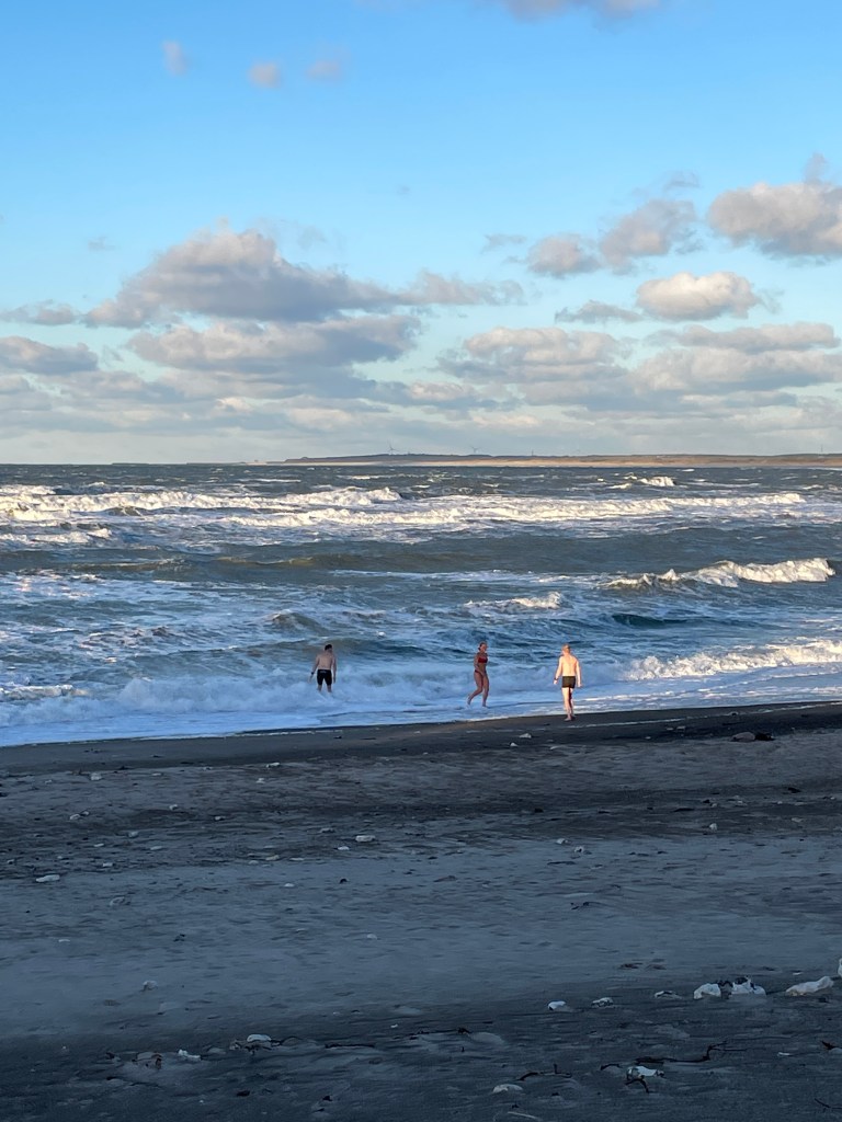 Martin havde fået den geniale ide at leje en mobil tønde-sauna, lige der på kanten af Klitmøller. Så bevæbnet med champagne og øl hoppede vi ind i varmen og nød hvordan vinden ruskede i bølgerne og også i vores lille sauna. Sandet slog mod ruden. Vi blev selvfølgelig så varme og letsindige af euforien over det veloverståede løb og boblerne at vi måtte i havet flere gange. Løbeturen derned var næsten det værste pga vinden og vandet var naturligvis koldt. Bølgerne væltede os omkuld men vi var ikke langt ude. Respekt for det hav i det vejr! Det var så fedt!