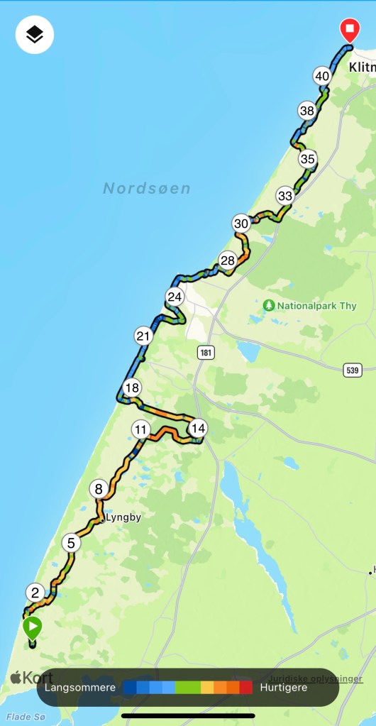 Jeg løb primært alene og fulgtes kun ca 10 min med en gut fra Ringkøbing. Jeg havde det stramt allerede efter 7 km, fordi min lænd værkede af “at læne sig op mod vinden”. Jeg løb hele tiden en lille smule mere foroverbøjet end jeg plejer for at stå imod modvinden. Men jeg havde det ok og var godt klar over at det nok ville blive vinden, der bestemte farten i dag. Ingen intentioner om en bestemt tid.