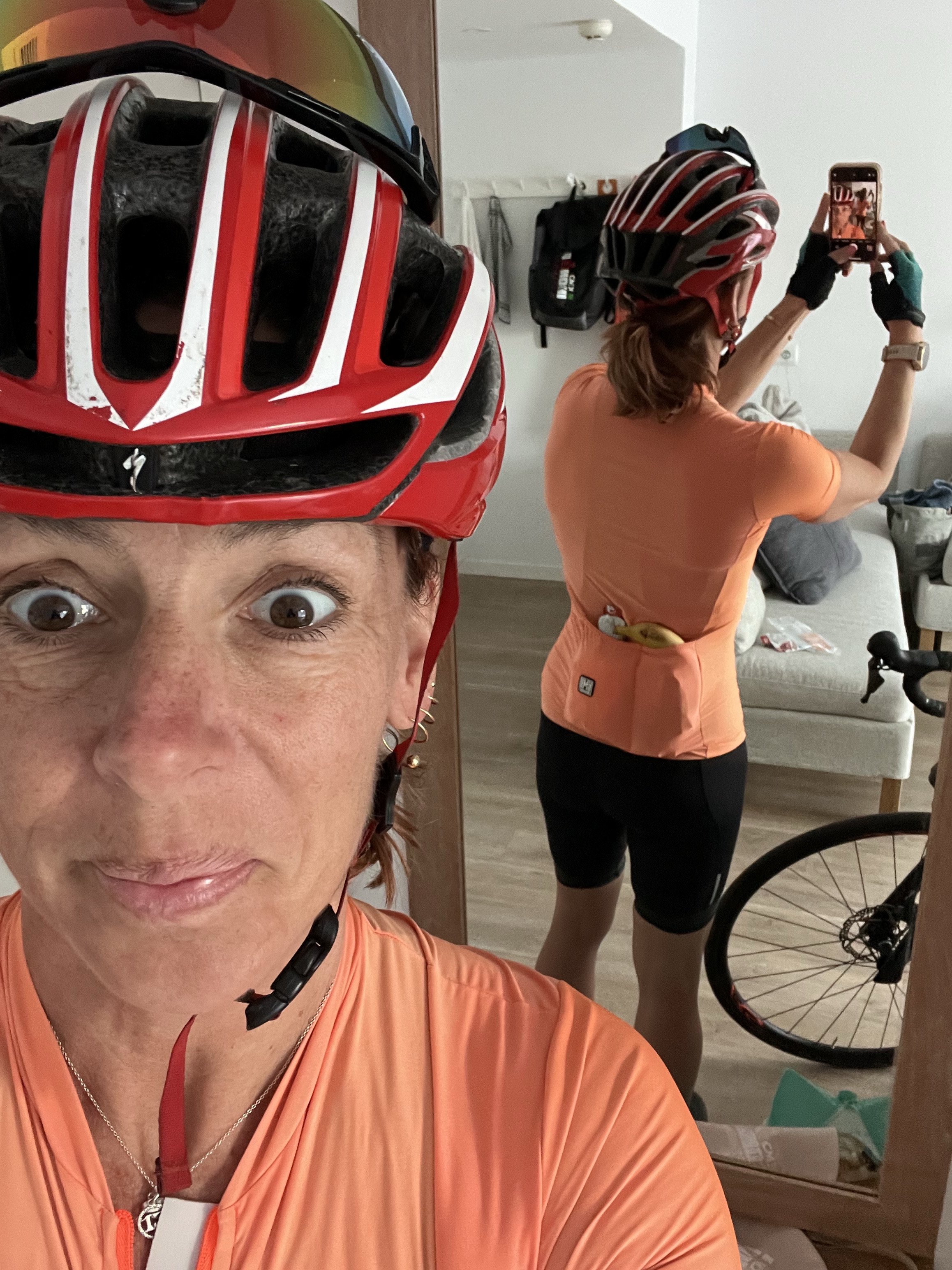Resten af turen hjem – ca 50 km – er ok nem derfra. Det går lidt op og ned fra Appelsinmanden og ca 10 km frem, men så går det rigtig meget nedad fra Col de Feminia. Vi lå på tog af hinanden de sidste 20 km – dvs Sofie (træner) og Ghita trak toget på fornemmeste vis.