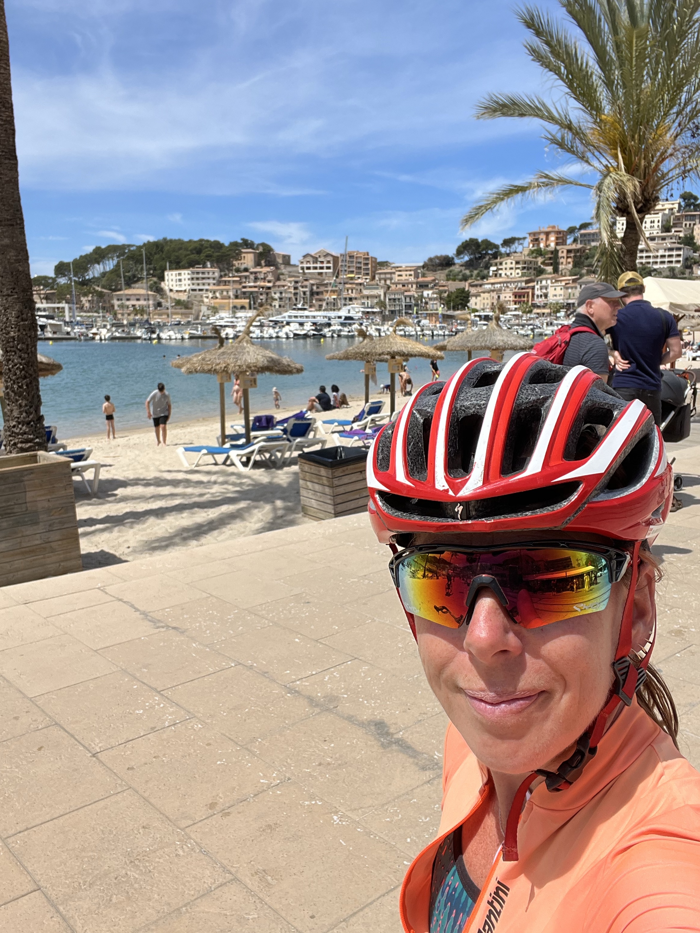 Nedkørslen fra Soller er sjov – mange korte hårnålesving, hvor man skal afpasse farten. Da vi kom i bund havde gruppen en punktering og den blev klaret mens mange ventede i rundkørslen i Soller. Vi kørte ned til Port de Soller og nød havnens smukke placering og spiste rygvarme madpakker suppleret med kolde drikkevarer fra Spar købmanden. Der har jeg aldrig været før og det var også meget smukt.