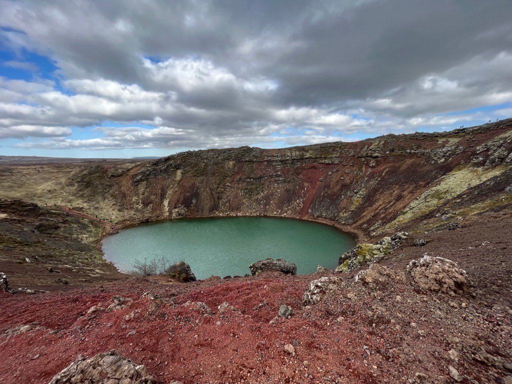 Efter gulfoss kørte vi videre hjemad og nåede også et flot stop ved Kerid Crater som vi gik rundt om og ned til kratersøen.