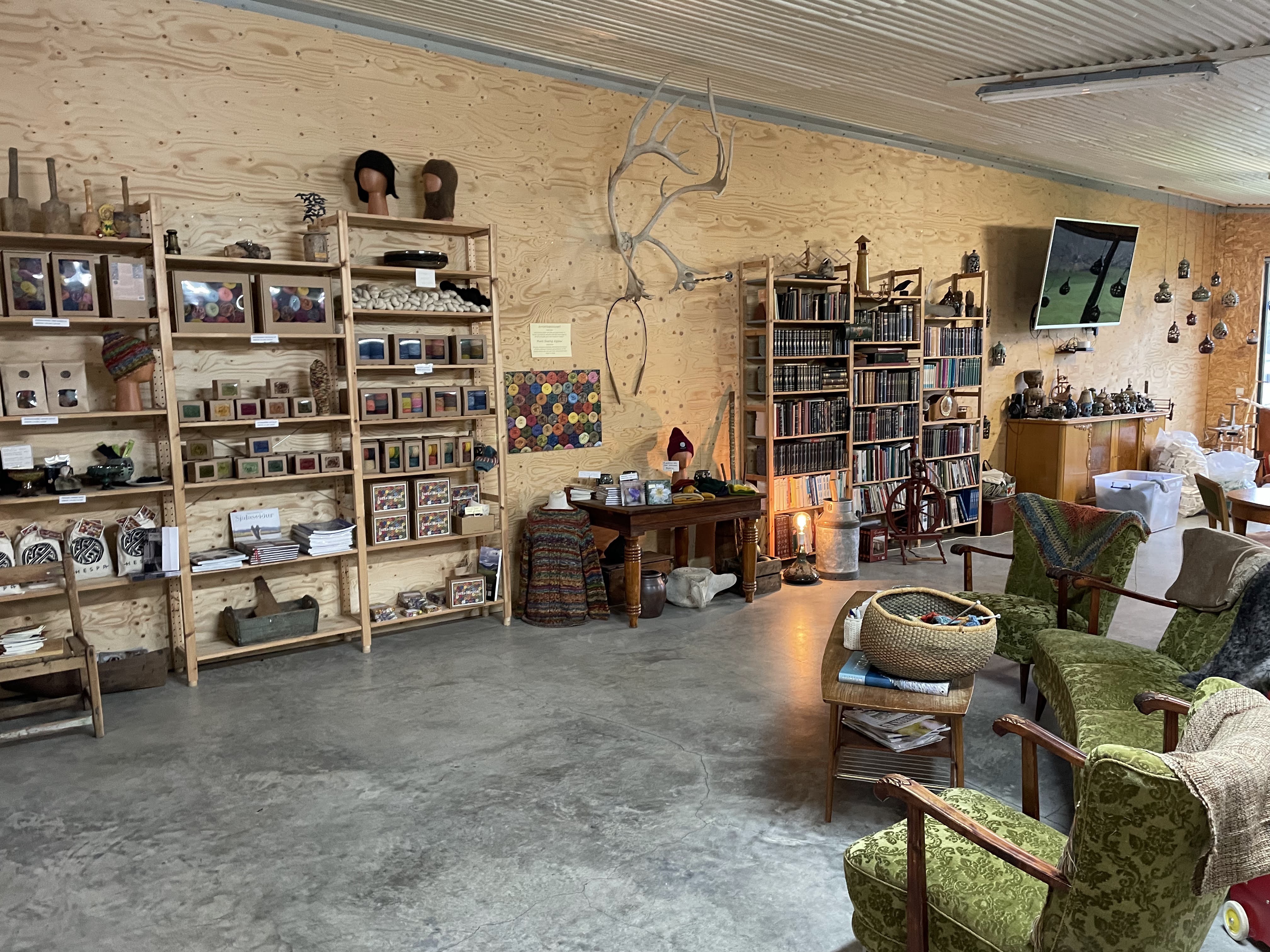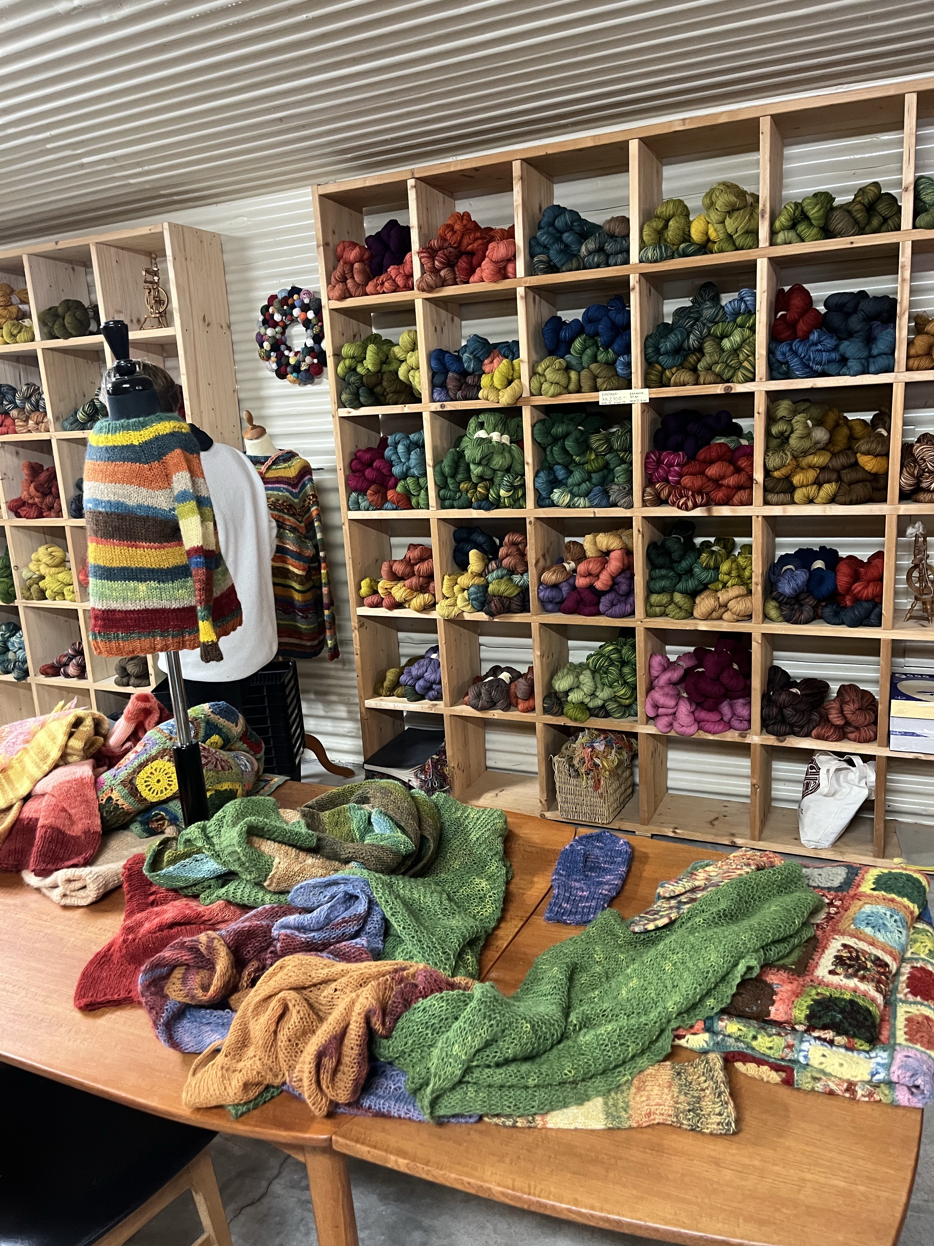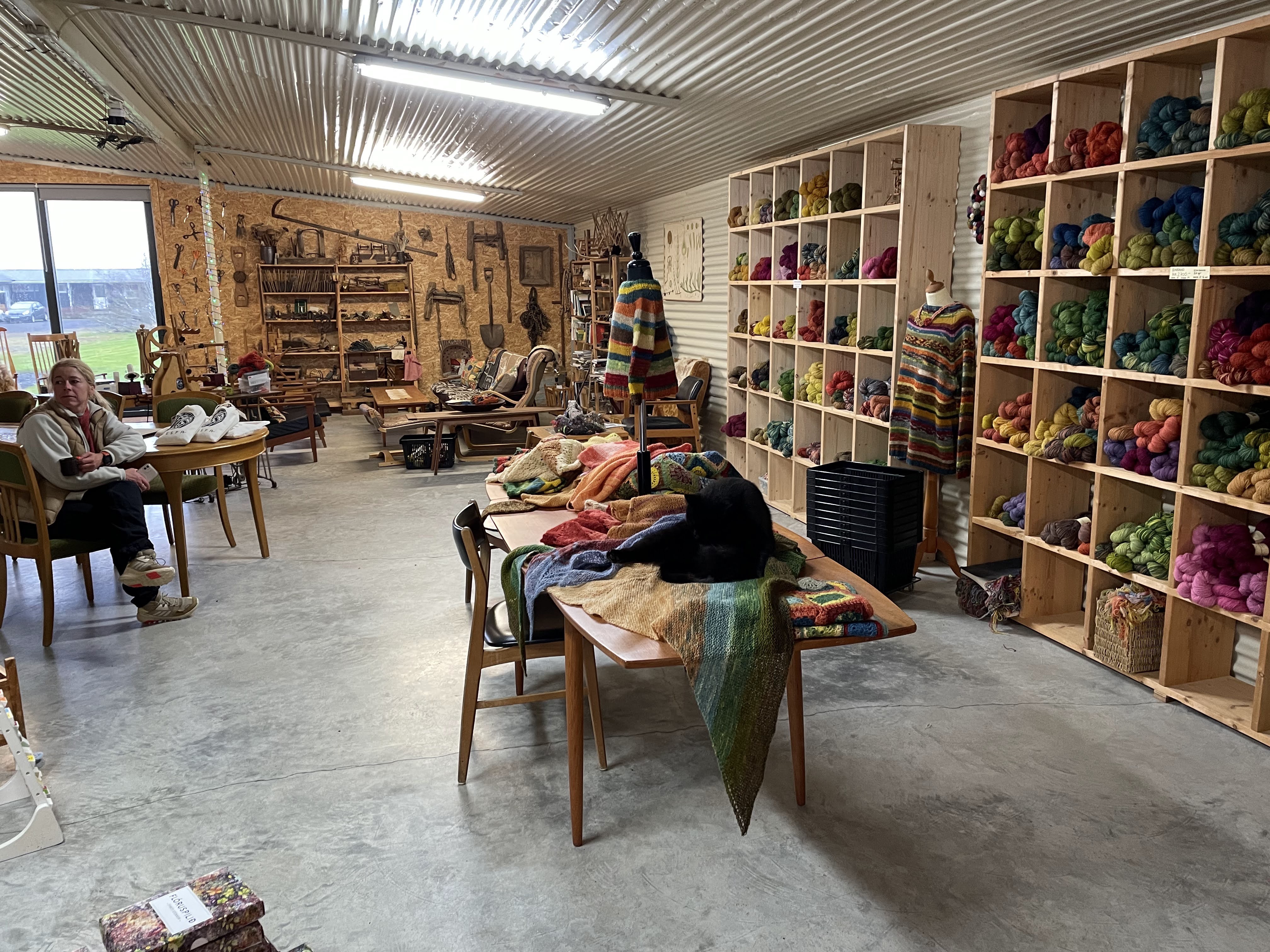 Efter kaffen i ridehuset havde jeg overtalt de andre til at køre 10 km videre for at besøge Gudrun som har sit eget håndfarve-garn studie med islandsk uld. Jeg havde ringet i forvejen fordi det er søndag men hun skriver på sin hjemmeside at man må komme hvis hun er der, og det var hun:-)