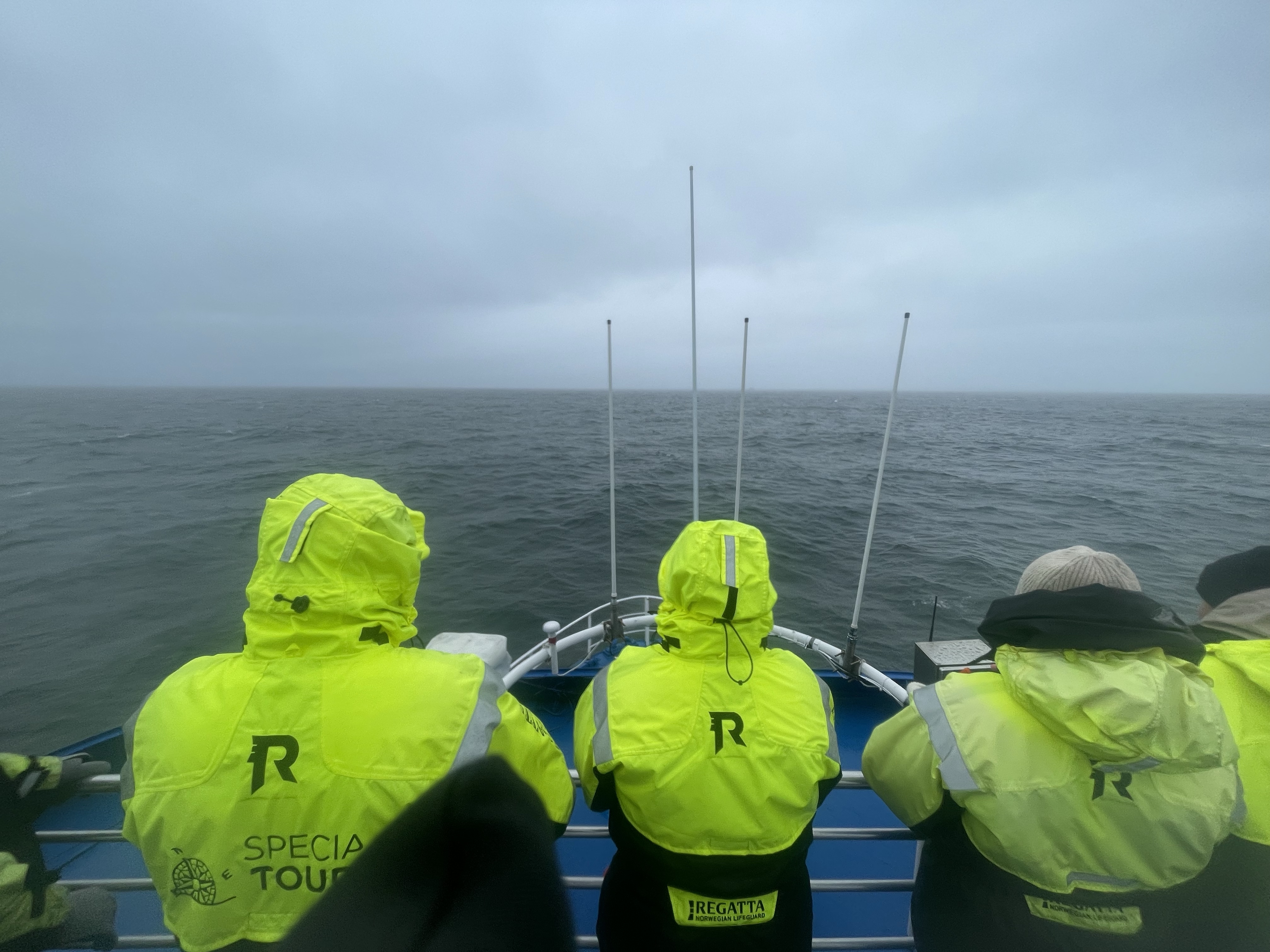 Trine sprang over, så vi tre tilbagelagde tre timer på havet, med fuld gyng-gang – desværre uden af se hvaler i de vanskelige vejrforhold.