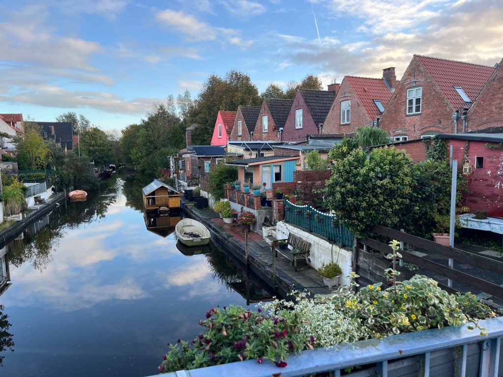 Efter ankomst i Friedrichstadt i regnvejr sidst på eftermiddagen fik jeg 7.5 våde km rundt og rundt i byen. Smukt, mudret og vådt langs kanaler, diger og sluser.