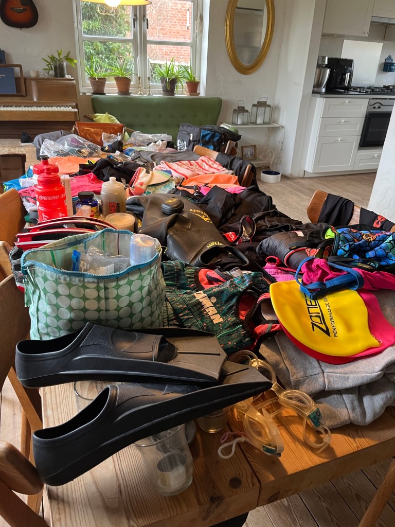 I dag smutter jeg afsted til Ønskeøen. Formiddagen er gået med at pakke – og det tager tid til 3 discipliner og “det løse”. Jeg synes at jeg har meget med men synes ikke jeg kan undvære noget- jeg har tre sæt cykeltøj og tre sæt løbetøj og trods alt kun en våddragt men to svømmebriller og tre badehætter (for det er lort, hvis de går i stykker).