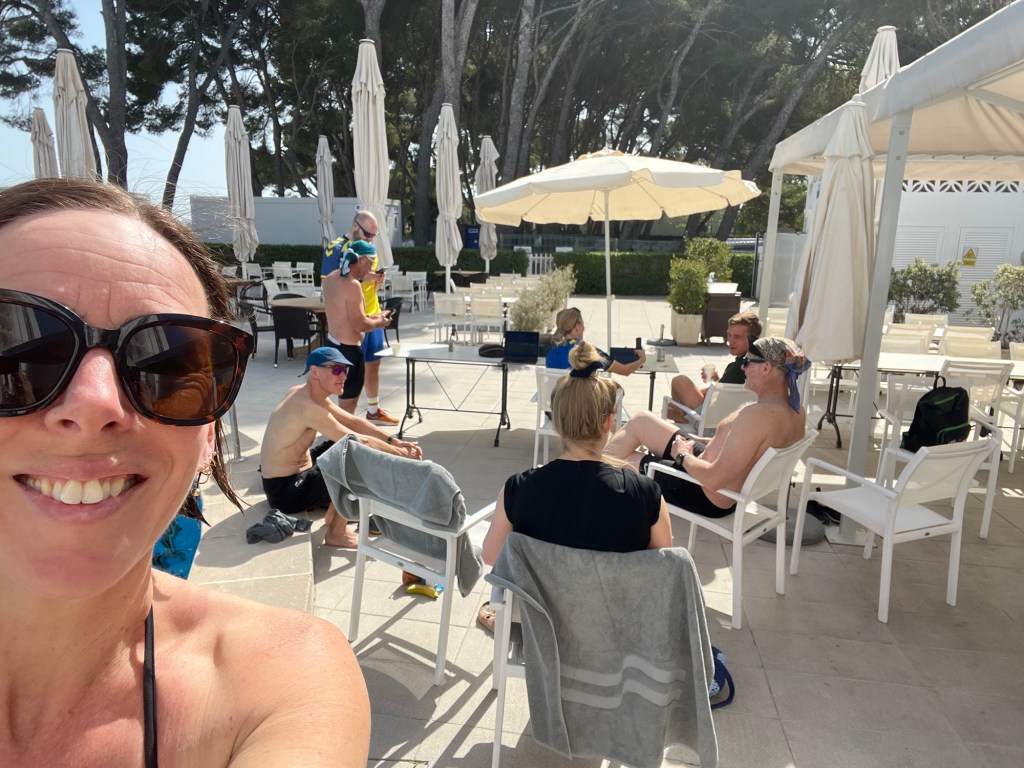 Morgensvøm 07.30 i det lækre klare og friske vand lige uden for døren af hotellet. 1000 m blev det til for mit vedkommende, jeg har ikke svømmet (eller cyklet) siden Helsingør 70.3 i juni sidste år, så særligt venstre skulder skulle lige varmes op og kønt er det ikke, selvom jeg kommer frem.