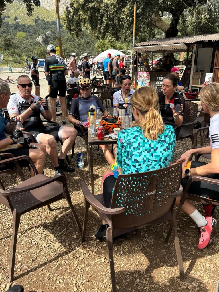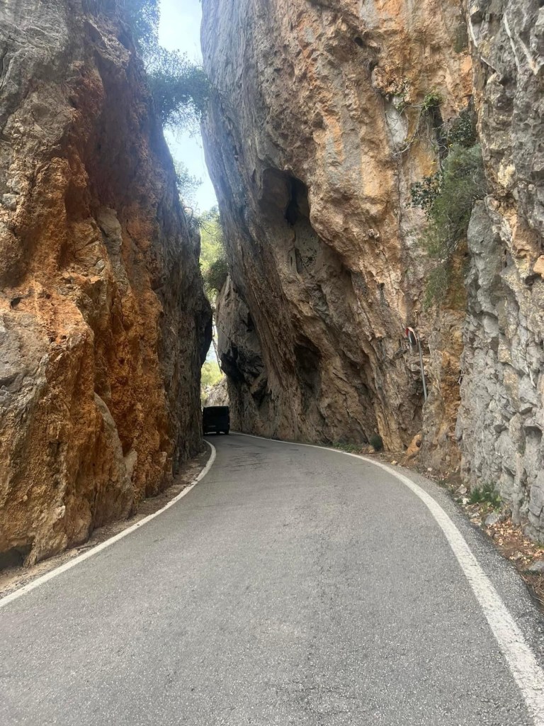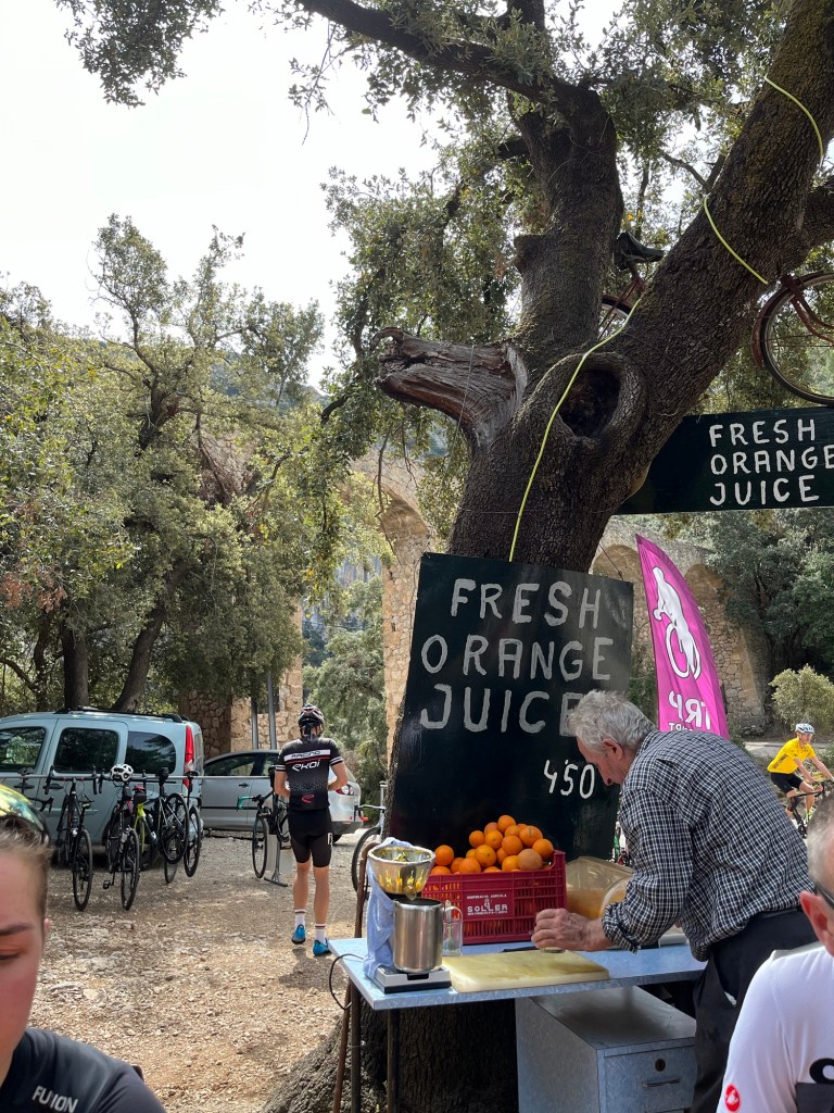 Vi havde er kort stop hos appelsinmanden inden vi indtog Sa Calobra . Vi har 12 til en start men flere faldt fra i løbet af dagen, Janni væltede endda et par gange og har fået flotte blå-lilla mærker på benene.