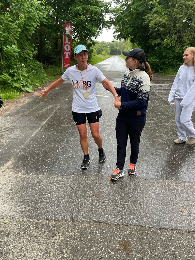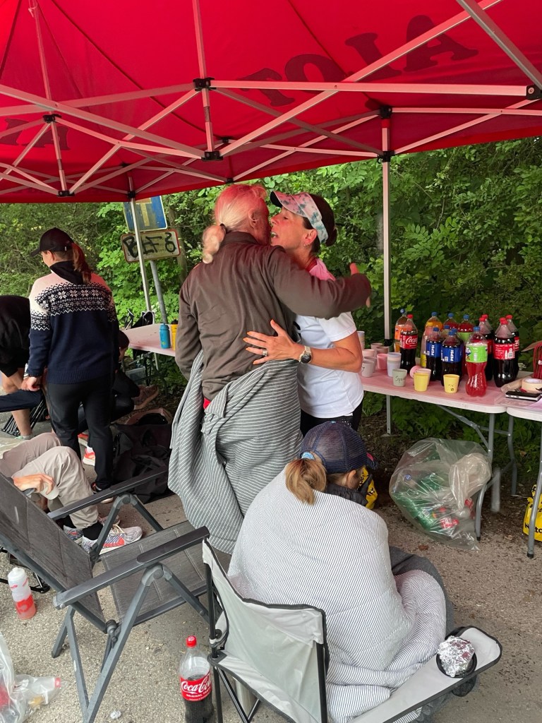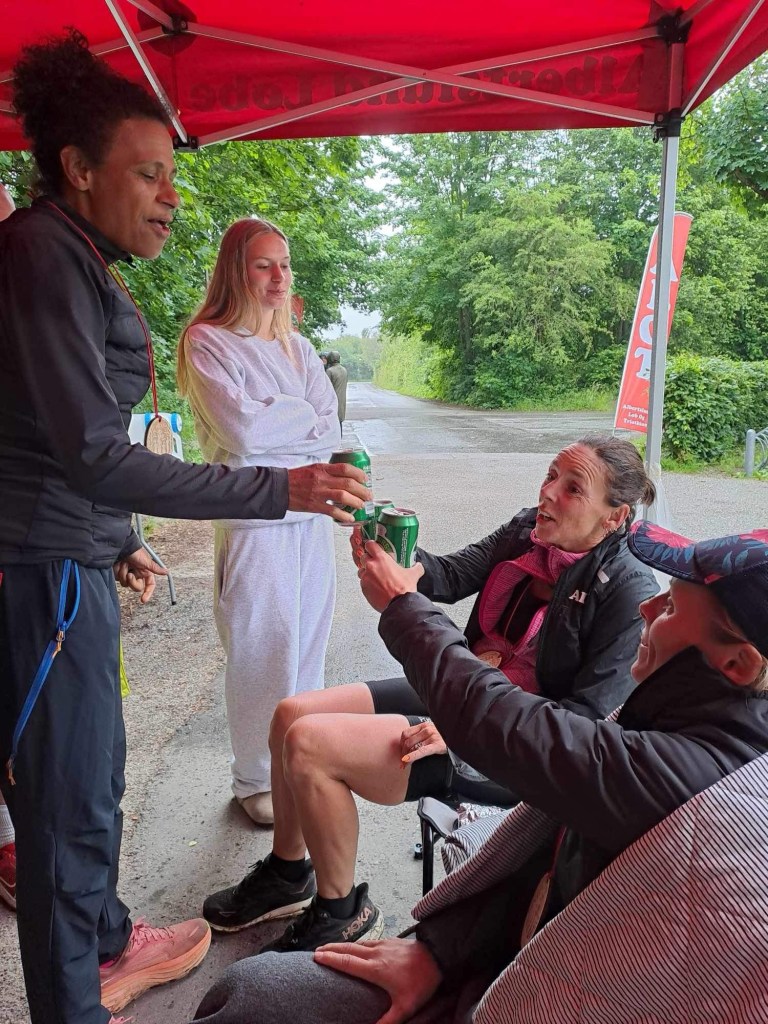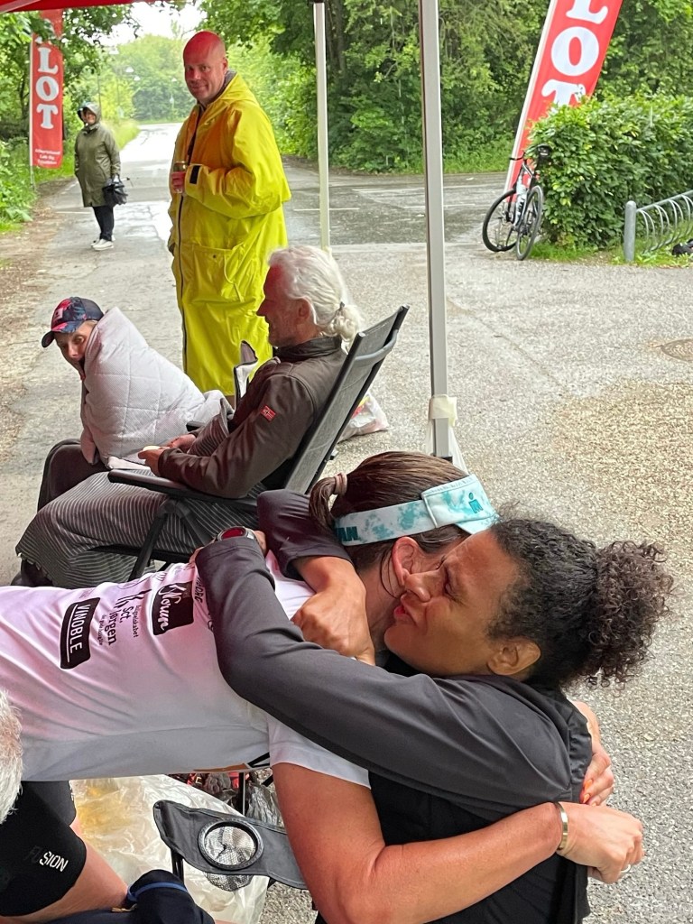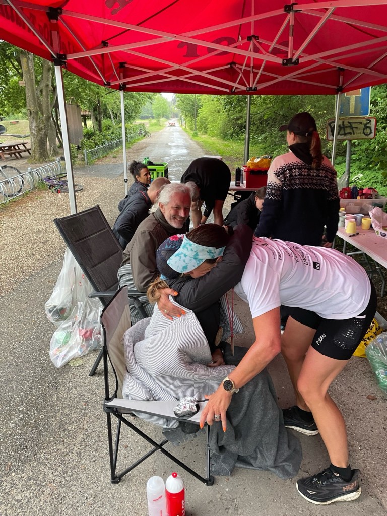 I teltet sad de andre – Jeanne var kommet flot ind i 10.51 og Mandy i 11.18 – der var sgu langt ned til en tillykke-krammer! Jeg snøftede noget i Carlas knus og skulle lige have hjælp til balancen.
