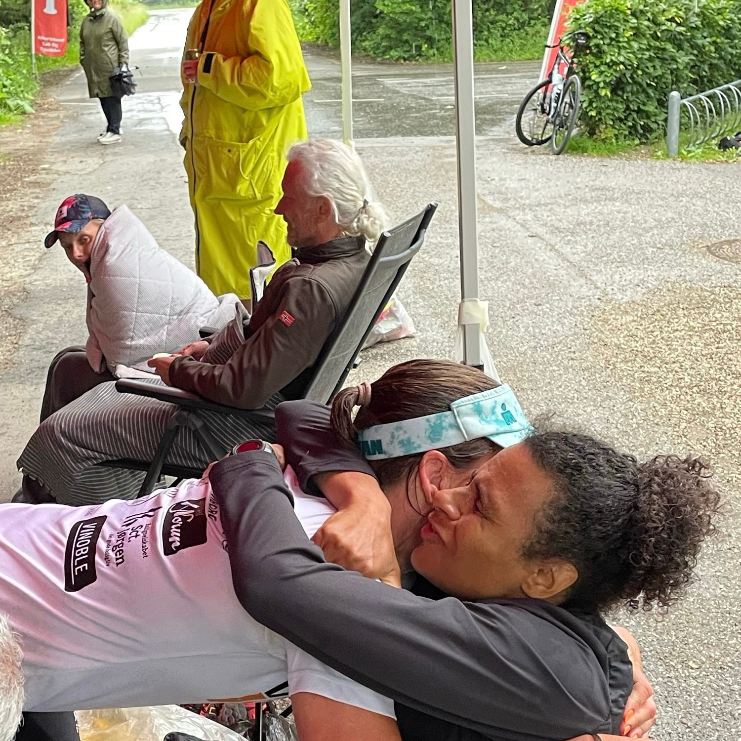 I teltet sad de andre – Jeanne var kommet flot ind i 10.51 og Mandy i 11.18 – der var sgu langt ned til en tillykke-krammer! Jeg snøftede noget i Carlas knus og skulle lige have hjælp til balancen.