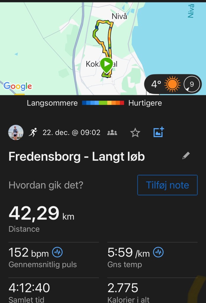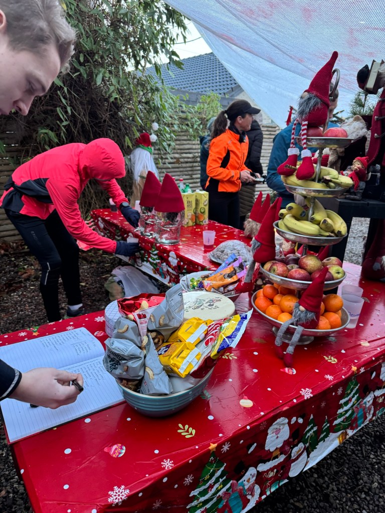 Dagens marathon var i Kokkedal med seriøst juledepot i privat indkørsel. Bålfad og oppyntning, frugt, slik, sodavand, kakao, juice, chips, havregrynskugler, og meget mere. Gløgg og æbleskiver, da vi kom i mål efter 6 runder a 7 km. Vi løb hver anden omgang modsat, for på den måde at kunne hilse på vores medløbere. Vi var 15 på marathon, 13 på halvmarathon og 7 på andre distancer (7 og 14 km)