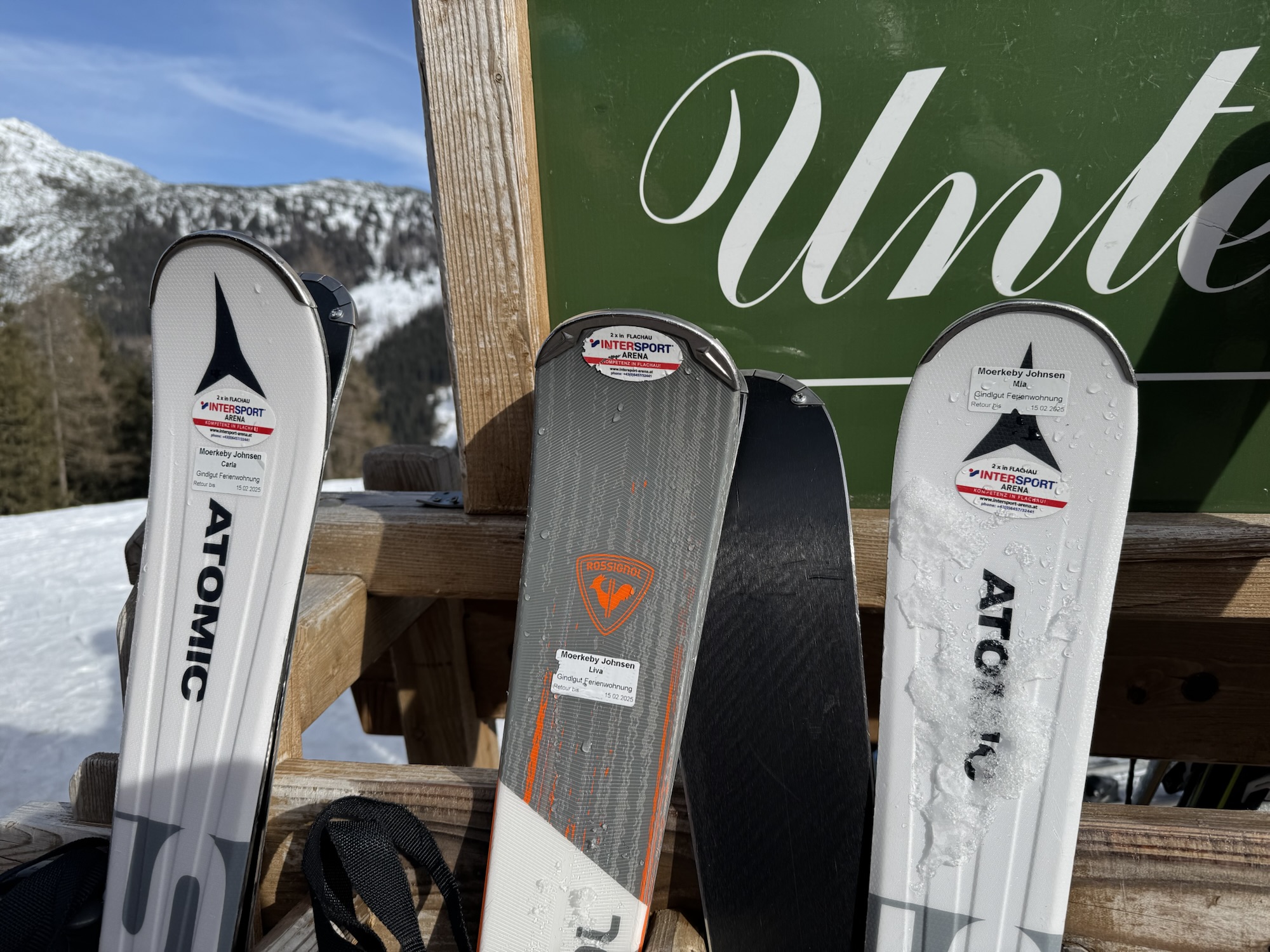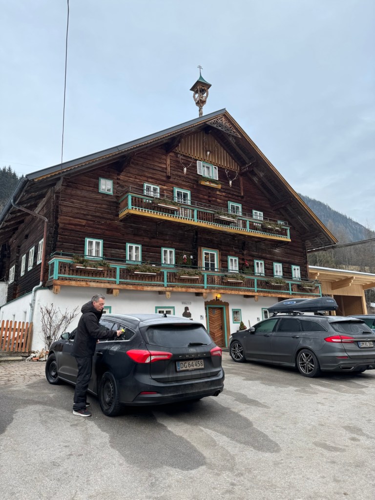 Vi har kørt 33-40 km på ski dagligt og da det væltede ned med sne, startede vi morgenstunden med at kælke på vores egen bakke – indkørslen op til boligen ca 4 km udenfor Flachau, hvor vi boede i et ældre pensionat med masser af charme og knirkende træ.