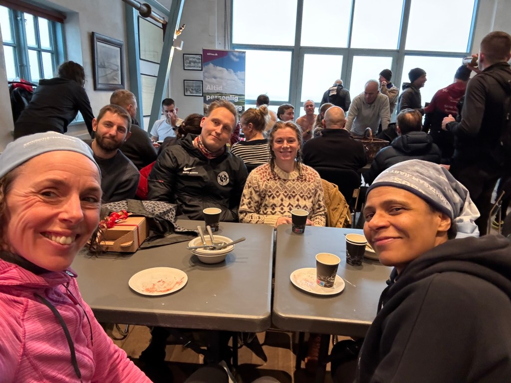 I takt med at vi kom i mål, fik vi en skylder og tørt tøj på og så fik vi suppe og æbleskiver i redningshuset – som vi plejer 😉